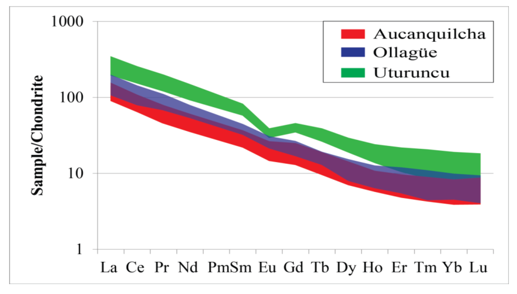 New whole rock analyses for Uturuncu rocks were performed at Washington State University, Pullman. Major and trace element analyses on 121 samples were performed by X-ray Fluorescence Spectrometry (XRF) on a ThermoARL Advant’XP+ automated sequential wavelength spectrometer (ThermoARL, Waltham, MA, USA). Methods and errors for the XRF analyses are described in Johnson et al. []. 65 distinct geochemical samples were further analyzed for trace elements, including the rare earth elements, by Inductively Coupled Plasma Mass Spectrometry (ICP-MS) on an Agilent Technologies 7700 ICP-MS (Agilent Technologies, Conesus, NY, USA). Methods and errors for trace element analyses are detailed in Jarvis [].