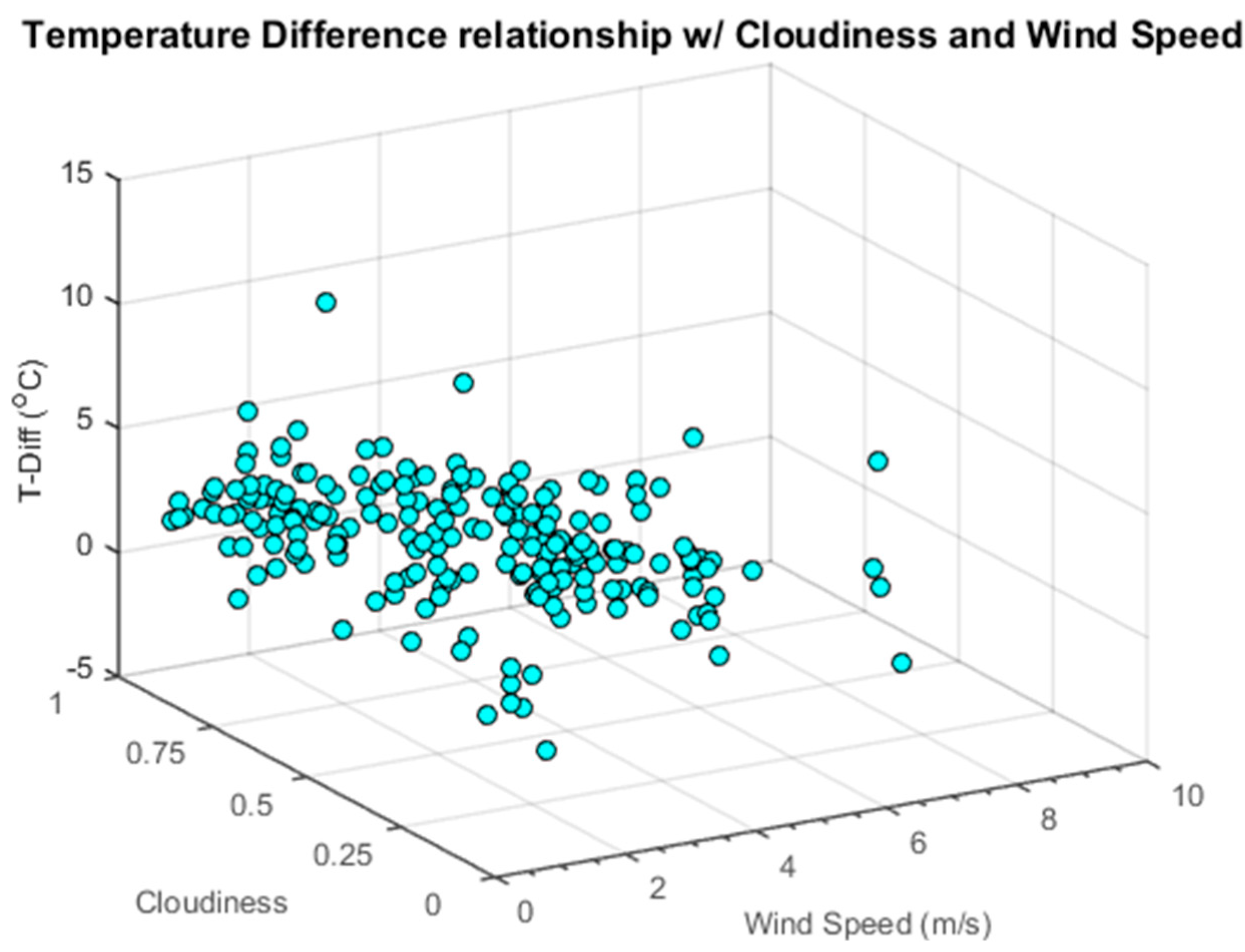Figure 3 illustrates the relationship between cloud cover, wind speed, and T-diff with a 3D scatterplot. A multiple linear regression analysis with linear coefficients was performed using cloud cover and wind speed as independent variables (inputs) and T-diff as the dependent variable (output). The results are illustrated in