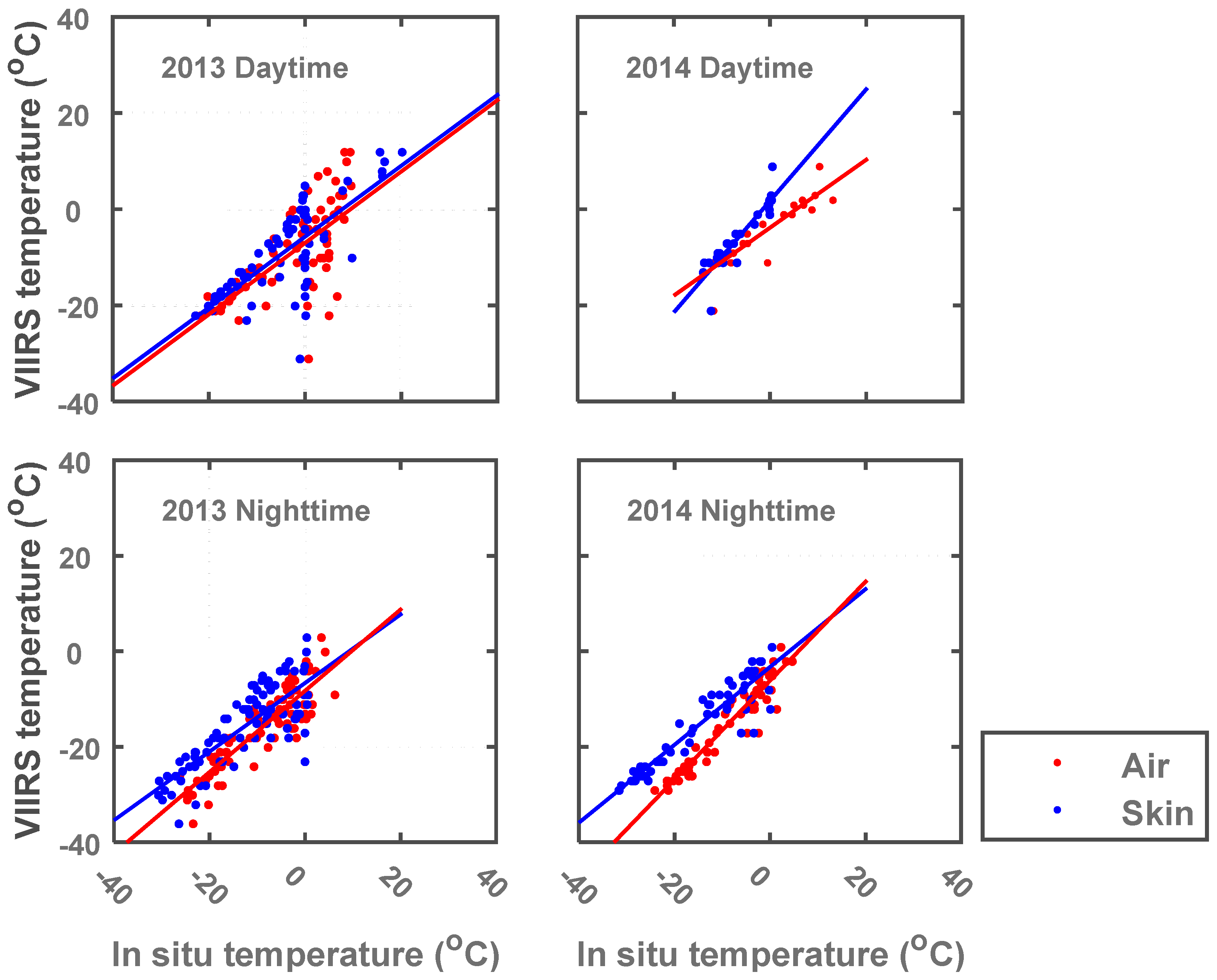 7]. For T-air, the correlation values fluctuate between 0.87–0.95 and 0.76–0.90, respectively. The correlations values range from 0.81–0.93 and 0.66–0.86 for T-skin. Results indicate that a higher correlation exists between T-air and the RS LST. VIIRS LST readings have a lower correlation with the T-skin values observed at CREST-SAFE. However, it should be noted that these values improved from one winter (2013) to the next (2014) for T-air and T-skin. This might be indicative of the continuous and ongoing improvements done to the VIIRS LST product. T-soil does not change much over time (remains around 0ºC), making it almost constant and naturally very different from RS LST, T-air, and T-skin. MAD daytime T-air values vary barely, ranging from 6.4–6.6 °C. Daytime MAD values for T-skin range from 4.6–5.0 °C. Nighttime MAD values for T-air and T-skin vary from 6.6–7.1 °C and 2.6–4.0 °C, respectively. VIIRS daytime biases vary from −6.11 °C to −5.76 °C and −4.35 °C to −2.68 °C for T-air and T-skin, respectively. Nighttime biases vary from −7.07 °C to −6.66 °C and −2.70 °C to −1.31 °C for T-air and T-skin, respectively. We can say that the evaluation results for nighttime are better than those during daytime, especially in terms of R and R