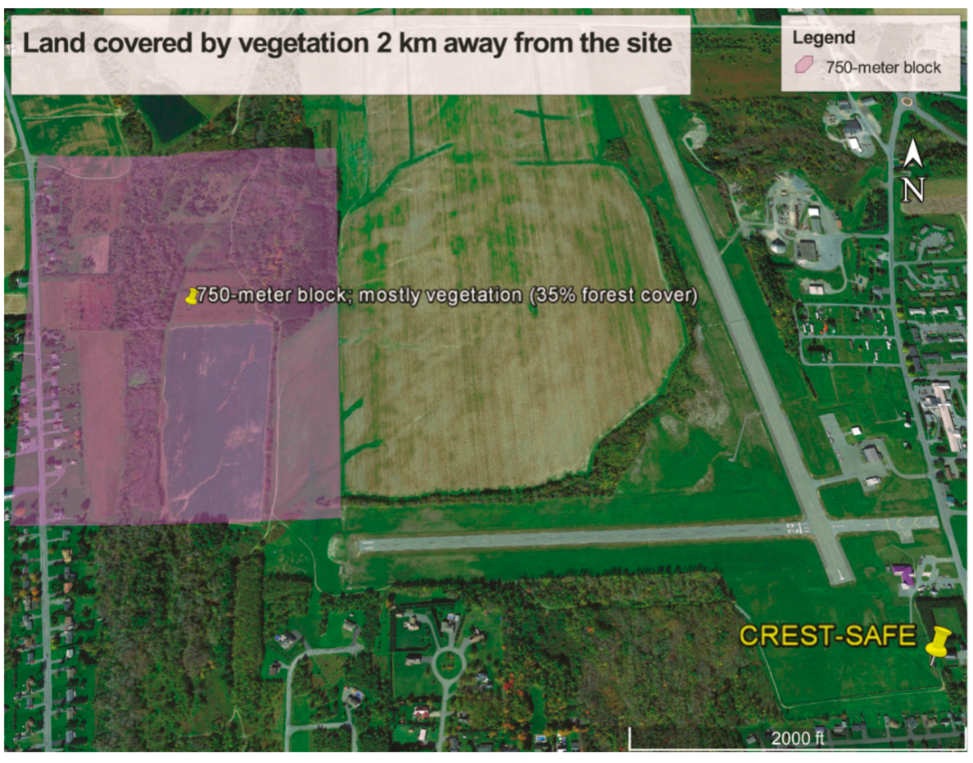 Figure 8, a 750 m block of land covered by forest and vegetation 2 km away from CREST-SAFE is illustrated. There are VIIRS LST satellite pixels in Caribou that have 100% forest cover but these are more than 10km away from the site, which would render the CREST-SAFE