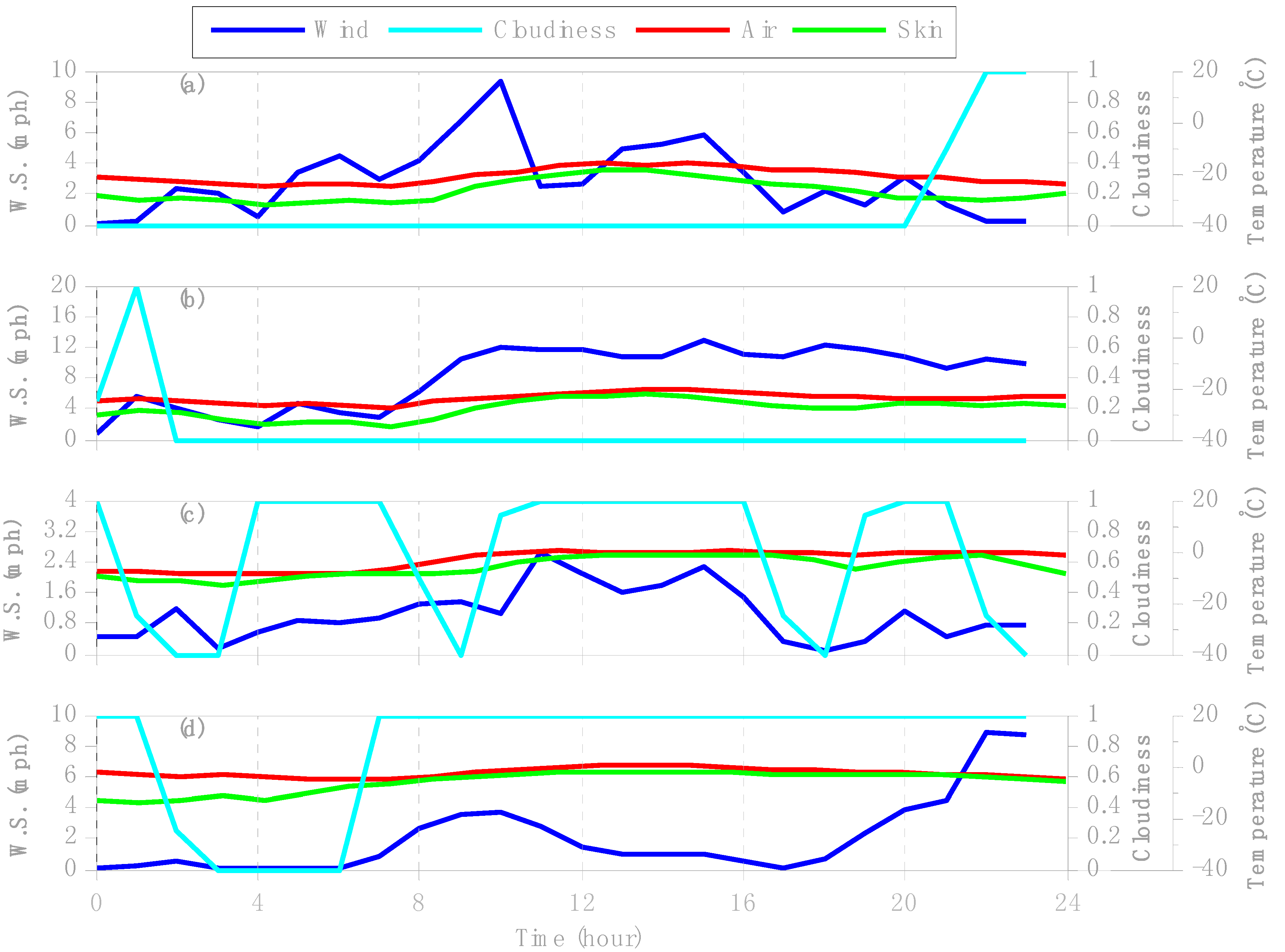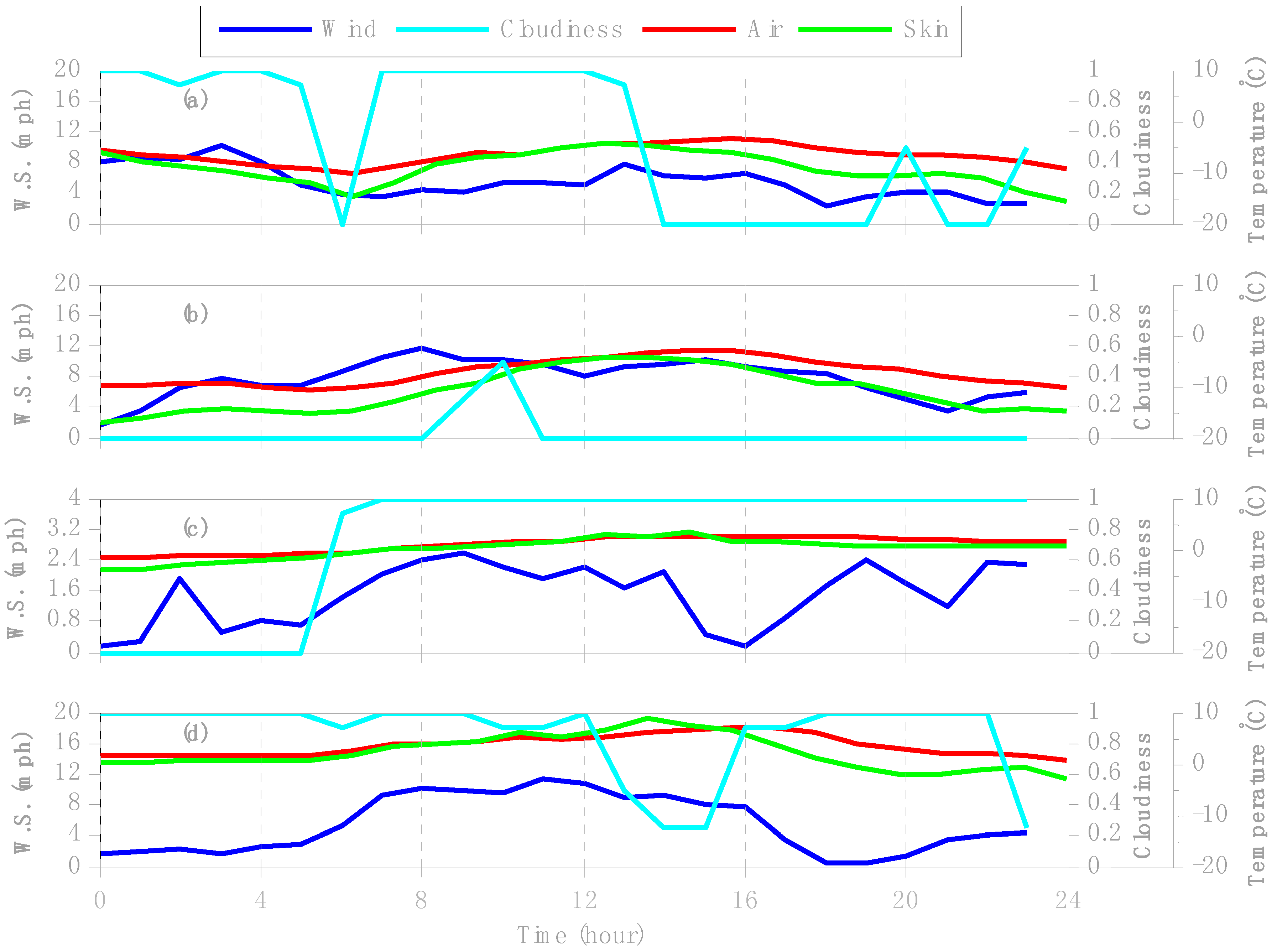 vs. in situ correlations are higher for winter 2014, since the CREST-SAFE 2014 data was recorded from late February onwards. CREST-SAFE 2013 data started logging from 1 January 2013. Lastly, CREST-SAFE hourly data indicates that both wind speed and cloud cover affect T-air and T-skin throughout the diurnal cycle.