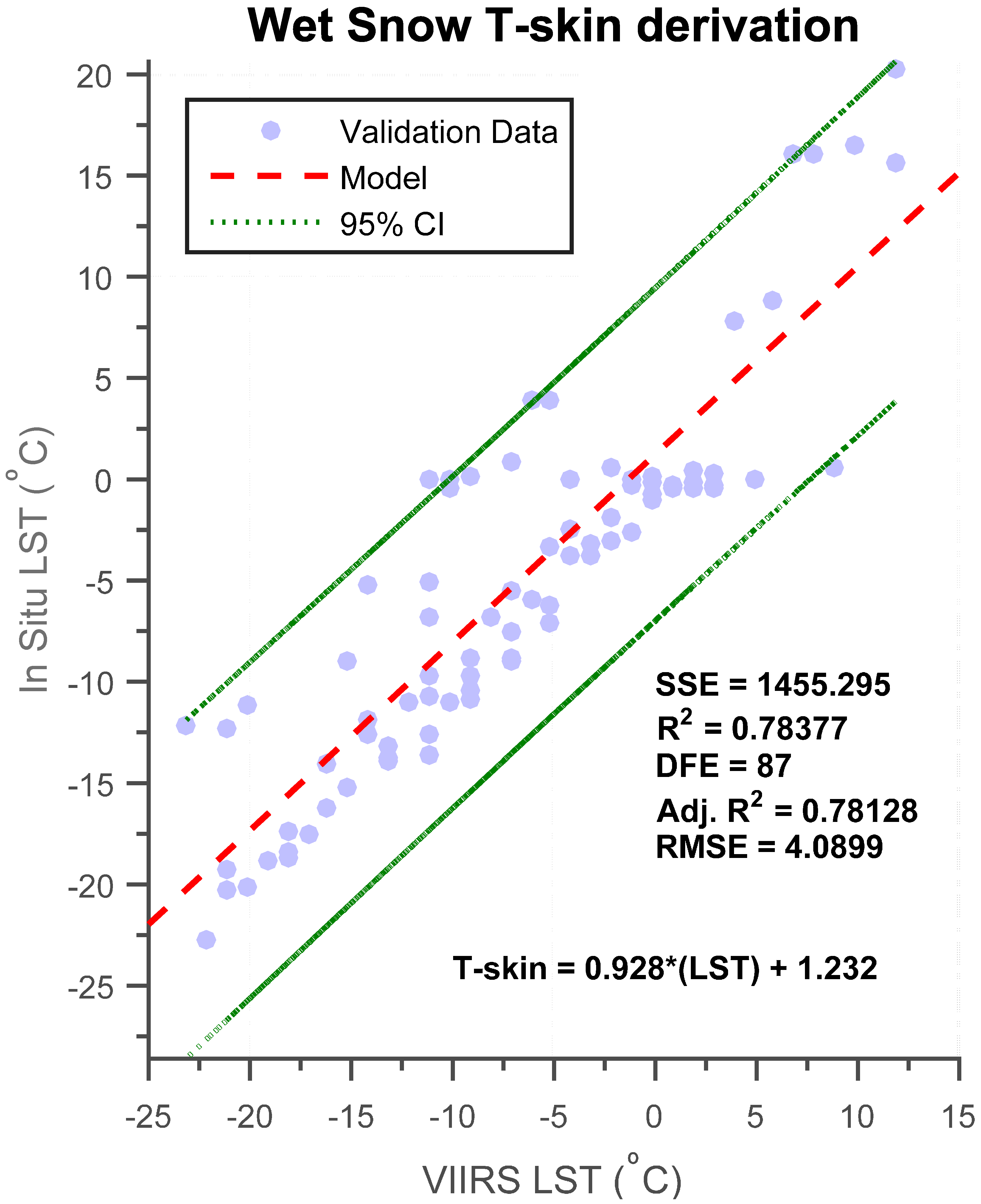 T-skin derived empirical formula based on linear regression model between clear-sky VIIRS LST daytime (wet snow) views with respective in situ temperatures at CREST-SAFE.