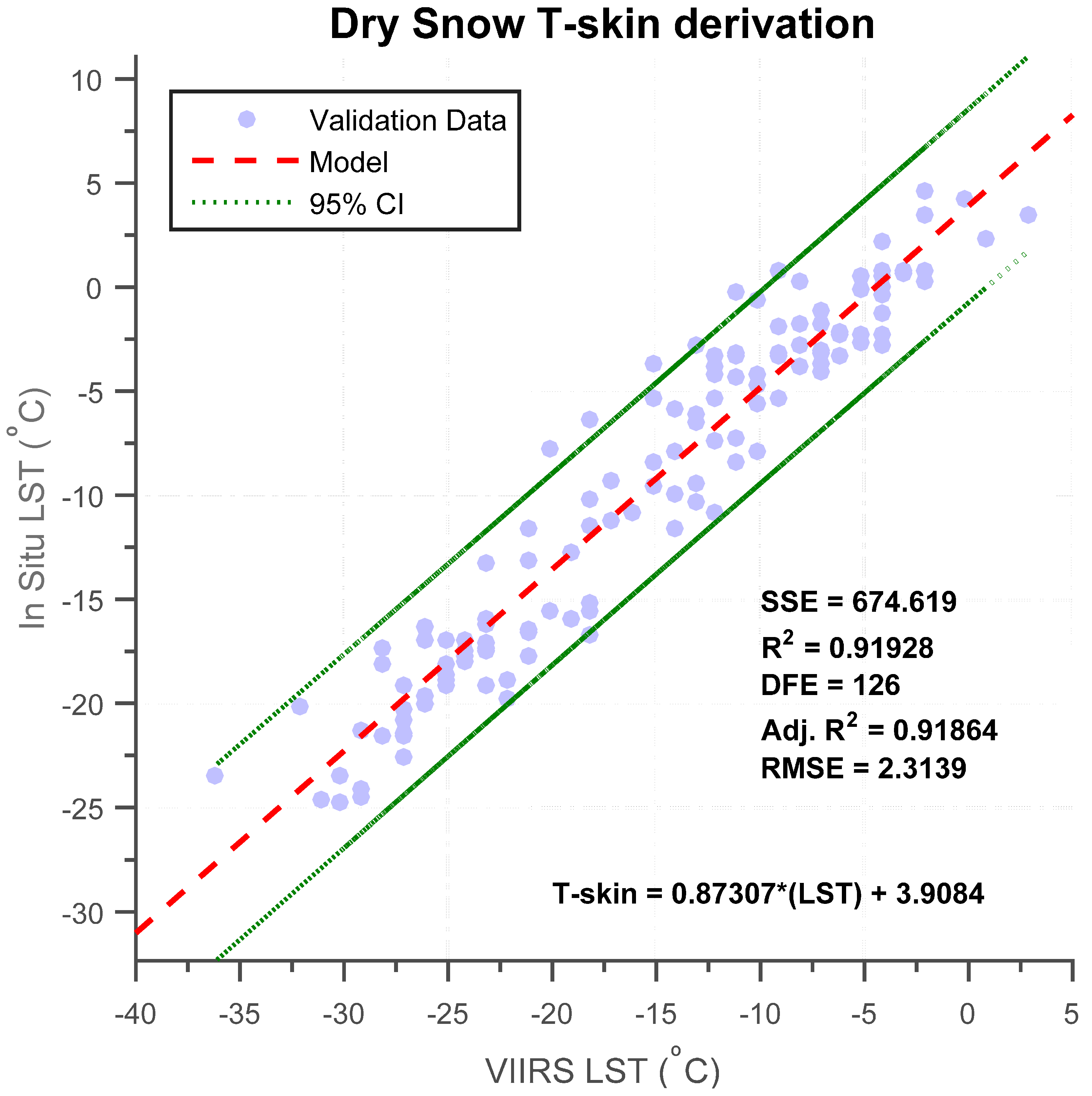 Figure 13 displays the validation data used to derive T-skin using RS LST under dry snow conditions (nighttime) based on the linear regression model (Equation (3)) that was created, and the 95% upper and lower confidence intervals (CIs) for the model. The Sum of Square Errors (SSE) and degrees of freedom are 674.62 °C