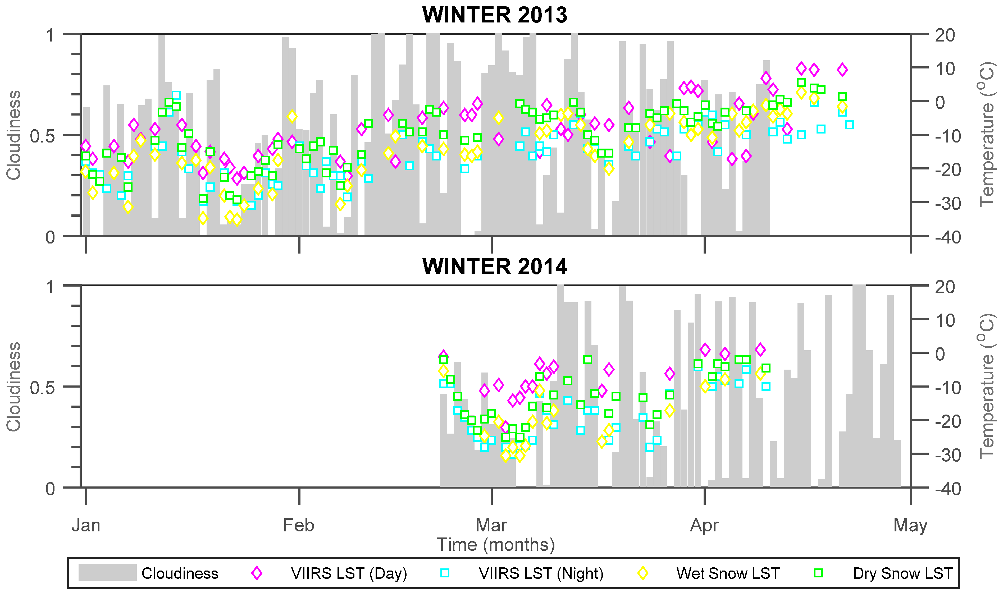 Section 3.3). T-soil does not fluctuate as radically (mainly remains around 0 °C) as T-skin and T-air throughout all winter months nor does it follow the same behavioral pattern. This makes sense since the soil surface is constantly covered by various snow layers isothermal at 0 °C, unlike the snow layers at the surface of the snowpack. The reason for all temperatures sharing the same behavior after mid-April in 2013 is due to the fact that a very thin snow layer (approximately 1 cm) remained and the Apogee Infrared Radiometer might have been reading the thermal energy produced by the soil directly instead of the snow surface’s thermal energy. However, for winter 2014, the snowpack depth was still 10cm in mid-April and remained until 22 April 2014. The highest accumulated daily snowpack depths were 25 cm and 45 cm for 2013 (late February) and 2014 (mid-March), respectively. VIIRS LST readings deviate significantly from T-skin, T-soil, and T-air daily averages. Particularly for the nighttime overpasses, corroborating the importance of temporal matching.