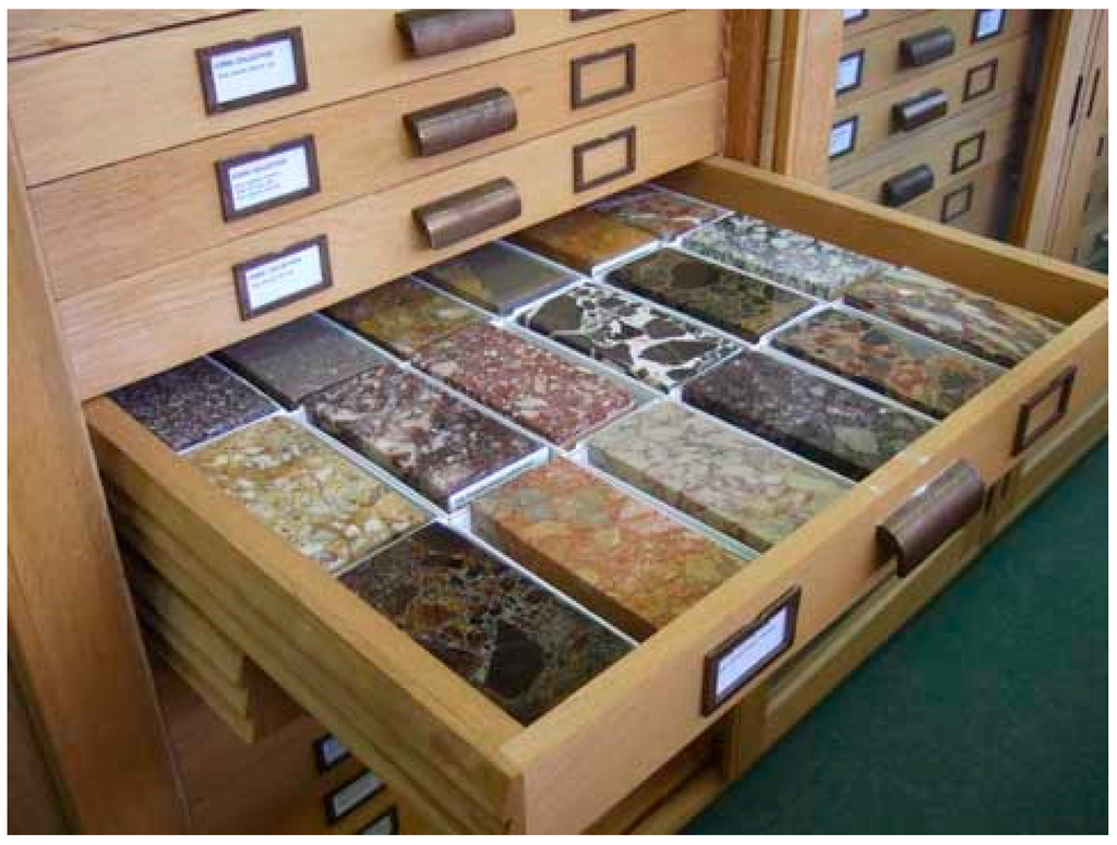 One was developed for the Spanish Royal Family when, after a severe fire at their palace in 1734, they decided to build a new palace using as many “marbles and ornamental stones” as possible in construction []. They favoured stones from Spain but, if materials did not suit the King’s aesthetic tastes, “marbles” were sought elsewhere, especially from Italy because that was the source of contemporary artistic and architectural inspiration. So, once again, the Roman preference for red stone became fashionable. Assembly of a set of samples was begun in 1740 and continued through the reigns of Kings Fernando VI, Carlos III and Carlos IV until 1759. The set is now part of the national heritage collections kept at the Royal Palace in Madrid (Figure 1). There are eight boxes with 40 compartments in each. Each compartment contains a sample of “marble” together with its location reference. Additional information is provided on a document included in each box, such as origin, distance from the quarry to the palace, (in Spanish leguas = leagues: originally, this was the distance that a person could walk in an hour) and abundance. Most samples came from Andalucía, Aragón and Catalonia. The collection is sometimes loaned for exhibitions such as that organized by the Colouste Gulbenkian foundation in Lisbon in 2014. It remains of great importance in establishing the selection of natural stones required for repair and maintenance by the royal authorities and has wider significance, but may not be well known outside Spain.