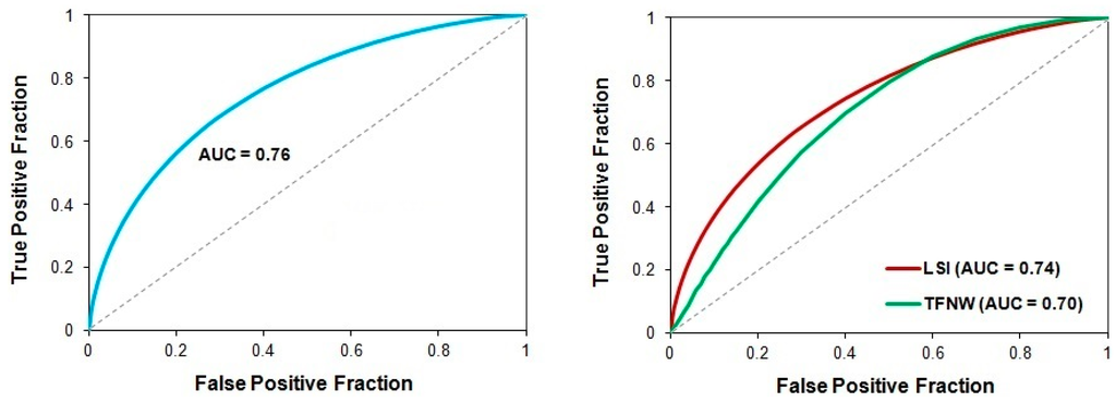 ROC curves for the integration LSI/TFNW model and the combined single models, LSI and TFNW.