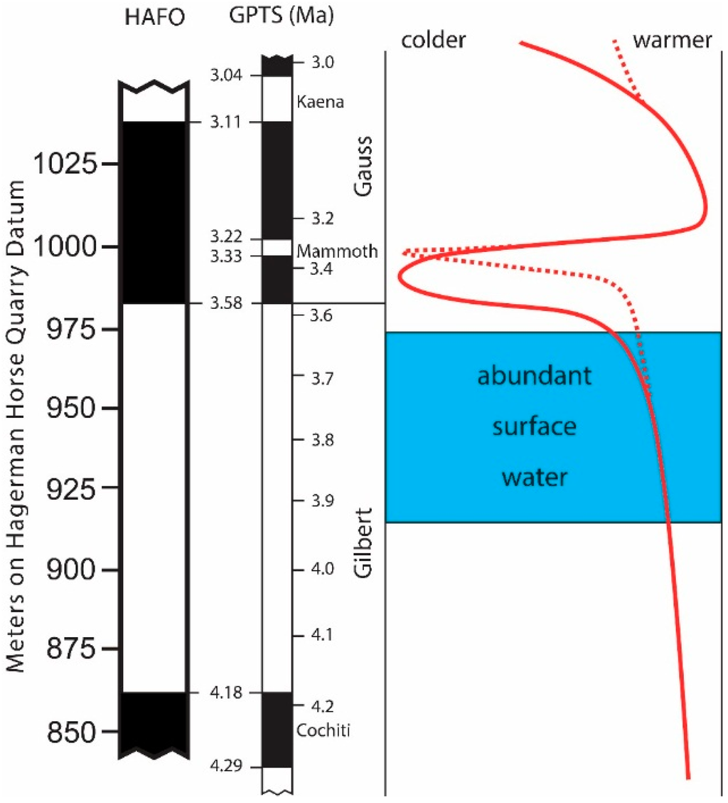 Pliocene paleoecological interpretations at HAFO. Temperature trend is adjusted to the chronology of deposits at HAFO []. Solid line indicates the temperature pattern exhibited by data generated from microfossil abundance; the dashed line illustrates where the isotopic data deviate []. Note that although the elevations are at a constant interval, the scale changes on the GPTS (after Berggren et al. []). Dates are in Ma and are not spaced consistently because sediment deposition rates varied; stratigraphic levels are in meters above mean sea level.