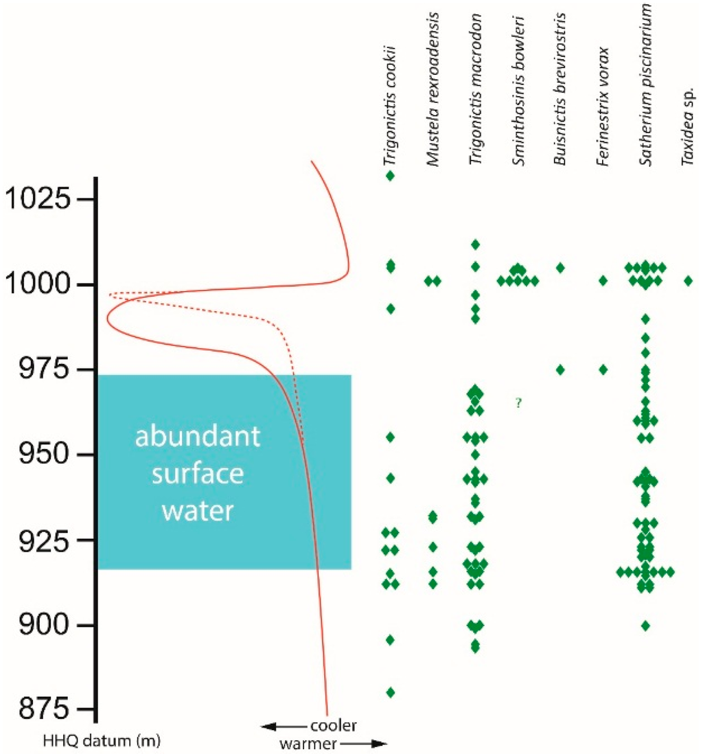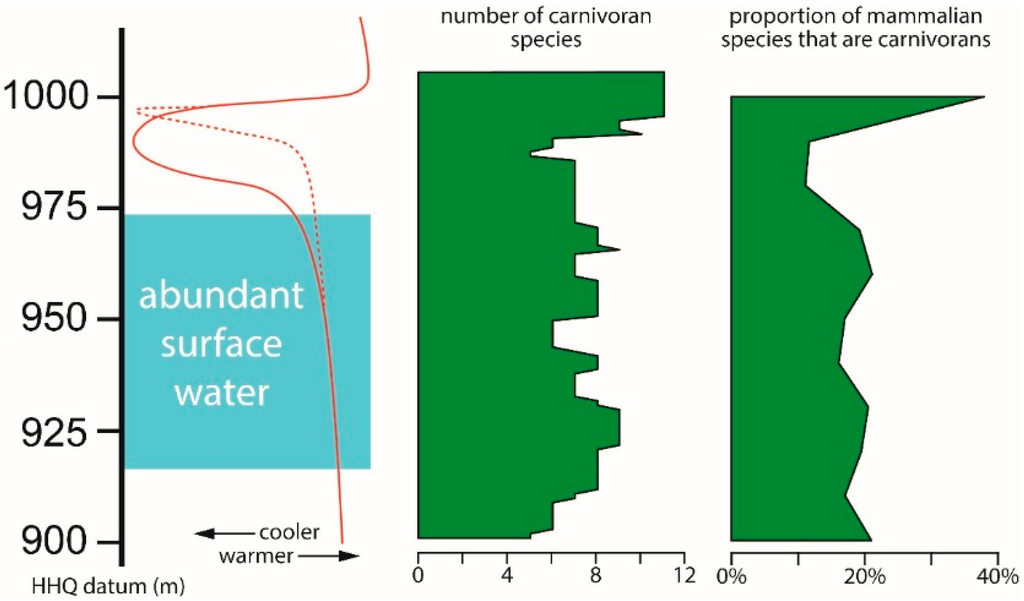 Beginning at about the 975 m stratigraphic level there is a faunal change at HAFO that coincides with the end of abundant surface water and a decrease in temperature. At this point, two mustelids, S. bowleri and F. vorax, first appear at HAFO. Mustelids reach their peak diversity at the warm, dry interval around 1000 m, while the diversity of large carnivorans is highest lower in the section, during an interval of abundant surface water as suggested by sedimentological data [].