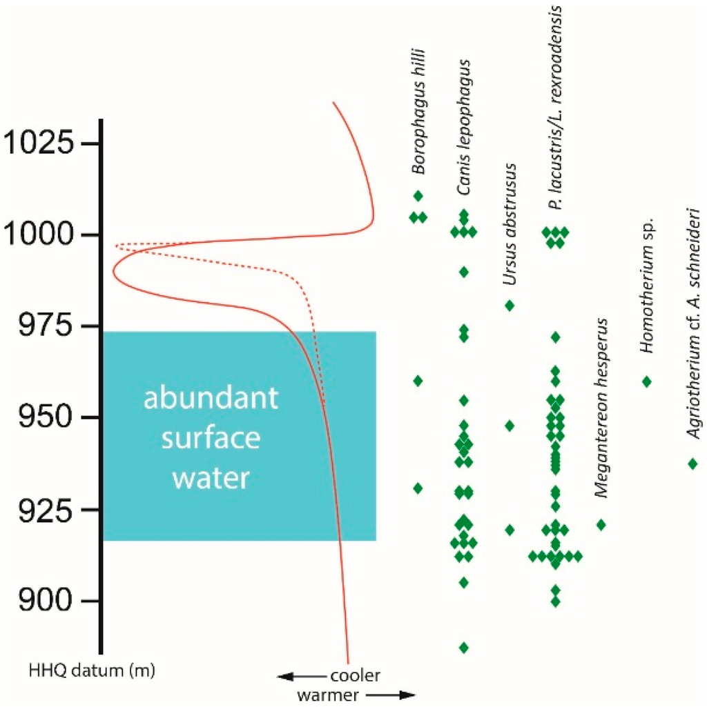 As in the case of some mustelids, two of the above large carnivorans have gaps in their record that correspond to the end of abundant surface water and the beginning of pronounced cooling. There is a 26 m (0.39 myr) gap in the distribution of P. lacustris/L. rexroadensis. A 45 m (0.51 myr) gap occurs in the range of the specimens of B. hilli, but again, that species is known from few fossils at HAFO. The range of Canis lepophagus does not include this significant gap, but localities within the cool interval only produced a single specimen. Records of U. abstrusus occur in intervals both with and without abundant surface water, but all are known prior to the abrupt cooling event at HAFO. The specimens of Megantereon hesperus, Homotherium sp., and Agriotherium cf. A. schneideri occur during warm periods of abundant surface water.