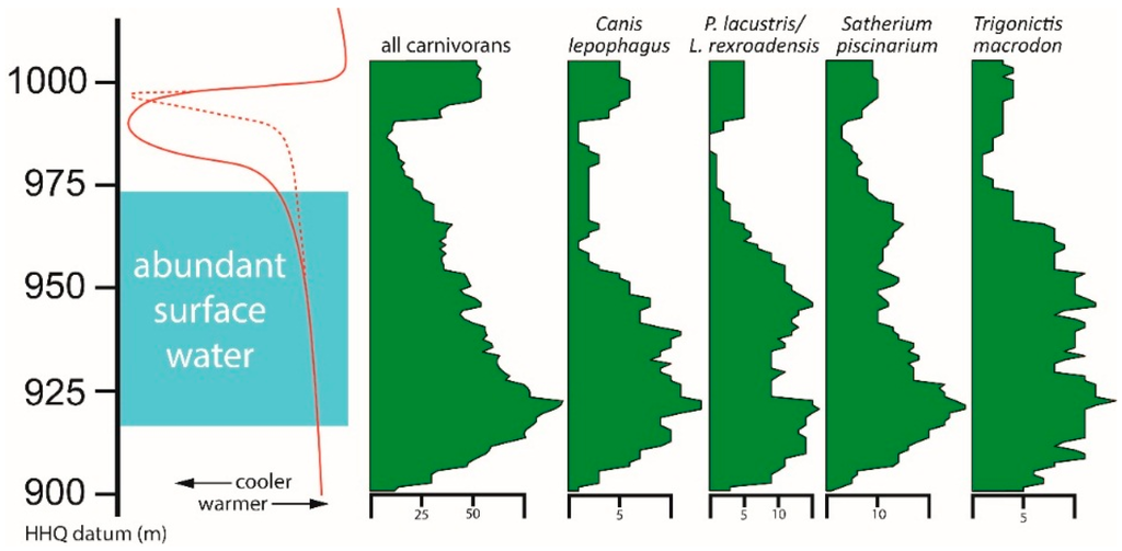 Among the abundant carnivorans, the specimen abundance of C. lepophagus begins a sharp decline with an increasing rate of cooling at 950 m; distribution of this species is seemingly unaffected by the presence or absence of abundant surface water. Likewise, P. lacustris/L. rexroadensis shows a reducing abundance of specimens before the end of the wet interval, and additionally has reduced numbers of specimens low in the section with abundant surface water. The abundance of T. macrodon does not decrease markedly until the end of the wet interval, where it actually increases through the continued cooling. Distribution of T. macrodon is here suggested as more dependent on the presence of surface water/moisture than temperature. The abundance of S. piscinarium appears linked to both temperature and surface moisture. The number of specimens decreases at the end of the wet interval, as in T. macrodon, but continues to decrease, matching the temperature curve.