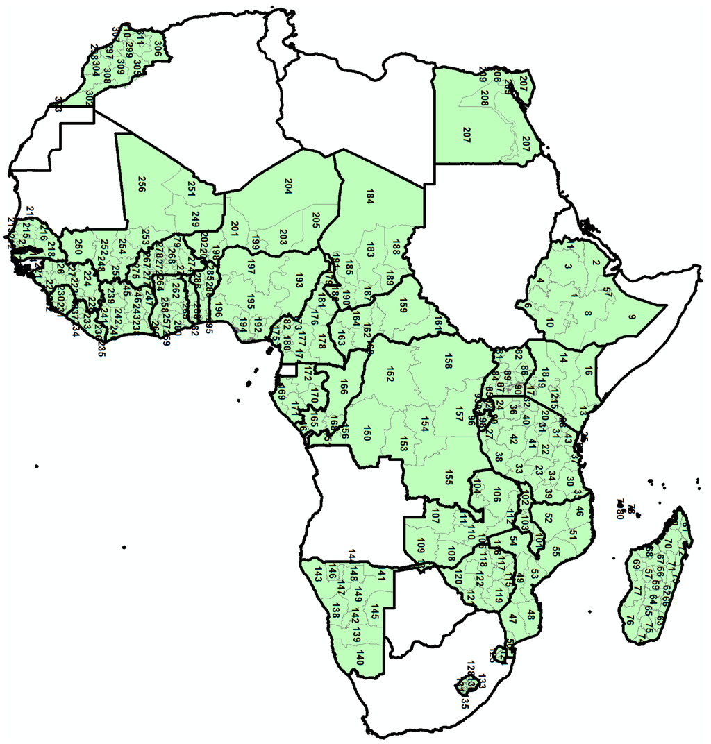 The DHS is an ideal vehicle for studying the linkages between women’s access to land and the context in which it takes place. In the DHS, women of age 15–49 who stayed in the household the night before the interview and who meet the survey eligibility criteria are eligible to be interviewed. Women are asked about the type of land they have access to and their responses are grouped into four categories: Own Land, Family Land, Rented Land and Someone Else’s Land. The first category “Own Land” refers to women who have access to land they own individually. The second category “Family Land” refers to women who have access to land owned by the whole family, family member or one which they own jointly with a family member, e.g., partner/husband. The third category “Rented Land” refers to women who access land which they pay for on a lease basis but does not belong to a family member. The fourth category “Someone’s Else’s Land” refers to women accessing land for free, which belongs to someone who is not a family member. In addition, the DHS also collects data about these women and their partners/husbands on a range of socioeconomic and demographic indicators, including information on age, marital status, level of education, wealth class, number of children, number of wives of partner/husband, and area of residence etc. With this information, it is possible to describe the type of land women have access to as well as the socioeconomic and demographic characteristics of these women. Furthermore, since late 1996, the DHS has consistently recorded the geographical location of each cluster of surveyed households with handheld Global Positioning Systems (GPS) units. This information now allows researchers to link DHS determinants and a spatial region/location thereby allowing the opportunity to account for the spatial variation of factors affecting women’s access to land. Because of the GPS units, data in this study were linked to administrative levels/regions within countries under study and these regions are shown in Figure 2 and their respective names can be found in Appendix.