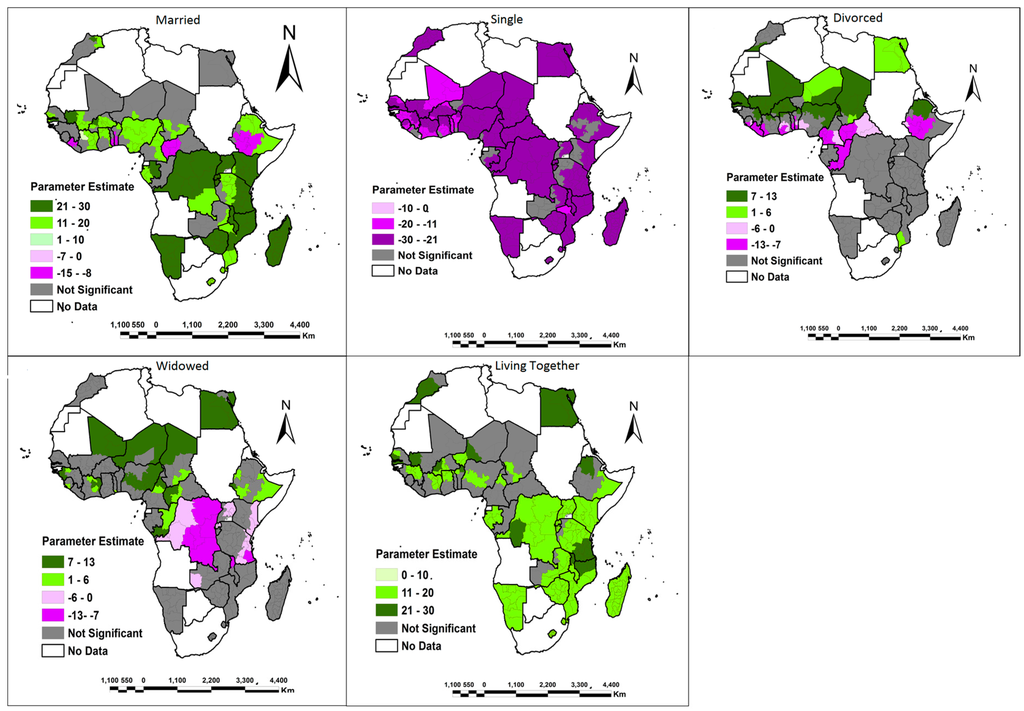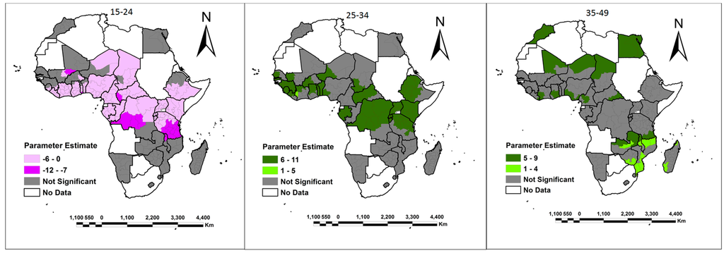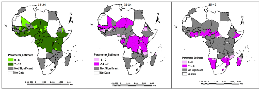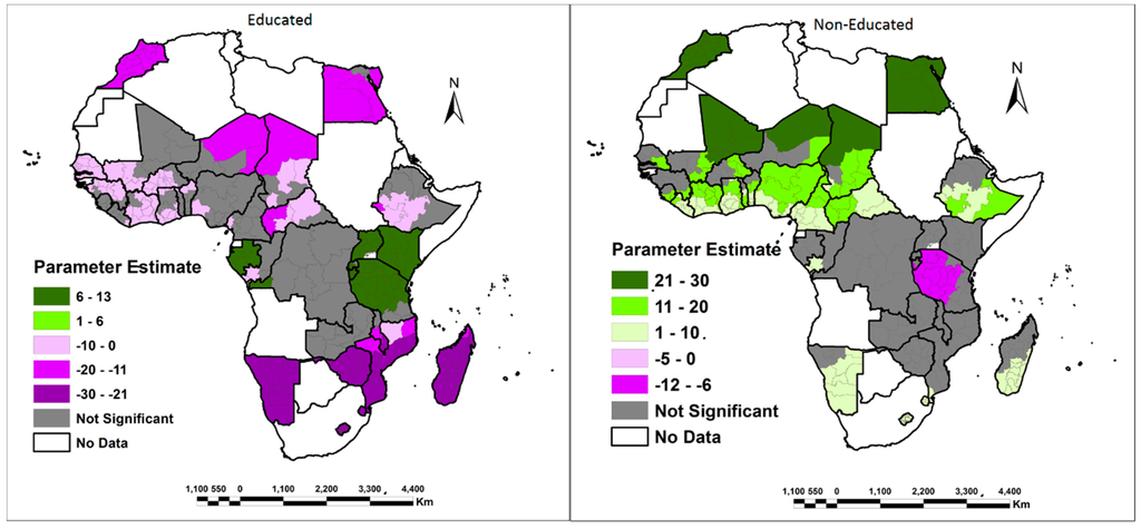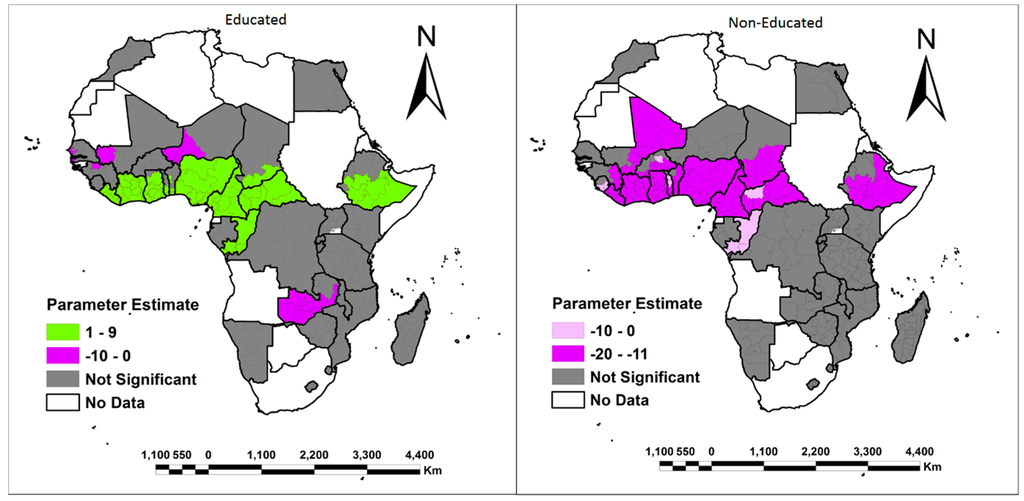 The other output of fundamental merit from the GWR model is its ability to simultaneously display and visualize both the parameter estimates and significance of each explanatory variable on either a choropleth map or raster surface. This makes the complex relationship that varies over space easier to comprehend. In this study, choropleth maps were used to show that there is a spatial variation in the relationship between the dependent variables (own land and family land) and the explanatory variables of education, marital status, age, wealth class, number of children, monogamous/polygamous relationships, place of residence, population density and the HIV epidemic across Africa. The choropleth maps showing the parameter estimates of the explanatory variables are shown in Figure 3, Figure 4, Figure 5, Figure 6, Figure 7, Figure 8, Figure 9, Figure 10, Figure 11, Figure 12, Figure 13, Figure 14, Figure 15, Figure 16, Figure 17, Figure 18, Figure 19 and Figure 20. For each map, a 90% significance threshold was used to mask out all areas in which the relationship between the dependent variables (own land and family land) and explanatory variables was not significant. In this study, it was implied that distinguishing between positive and negative parameter estimates (and associated t-values) in these areas was unnecessary. These areas were deemed to be of less interest to an analyst than those areas that were significant. Within the significant areas, there was evidence of both positive and negative relationships. Positive values highlight areas were an increase in the explanatory variables results in an equally increase in the chances of women in that region having access to either their own land or family land. On the other hand, negative values imply that a decrease in the explanatory variables results in an equally decrease in the chances of women in that region having access to either own land or family land. Consequently, the results of the spatial distribution exhibited by the variables under study in relation to women accessing own land or family land are analyzed and the possible reasons behind the distributions are discussed in the following sub-sections.