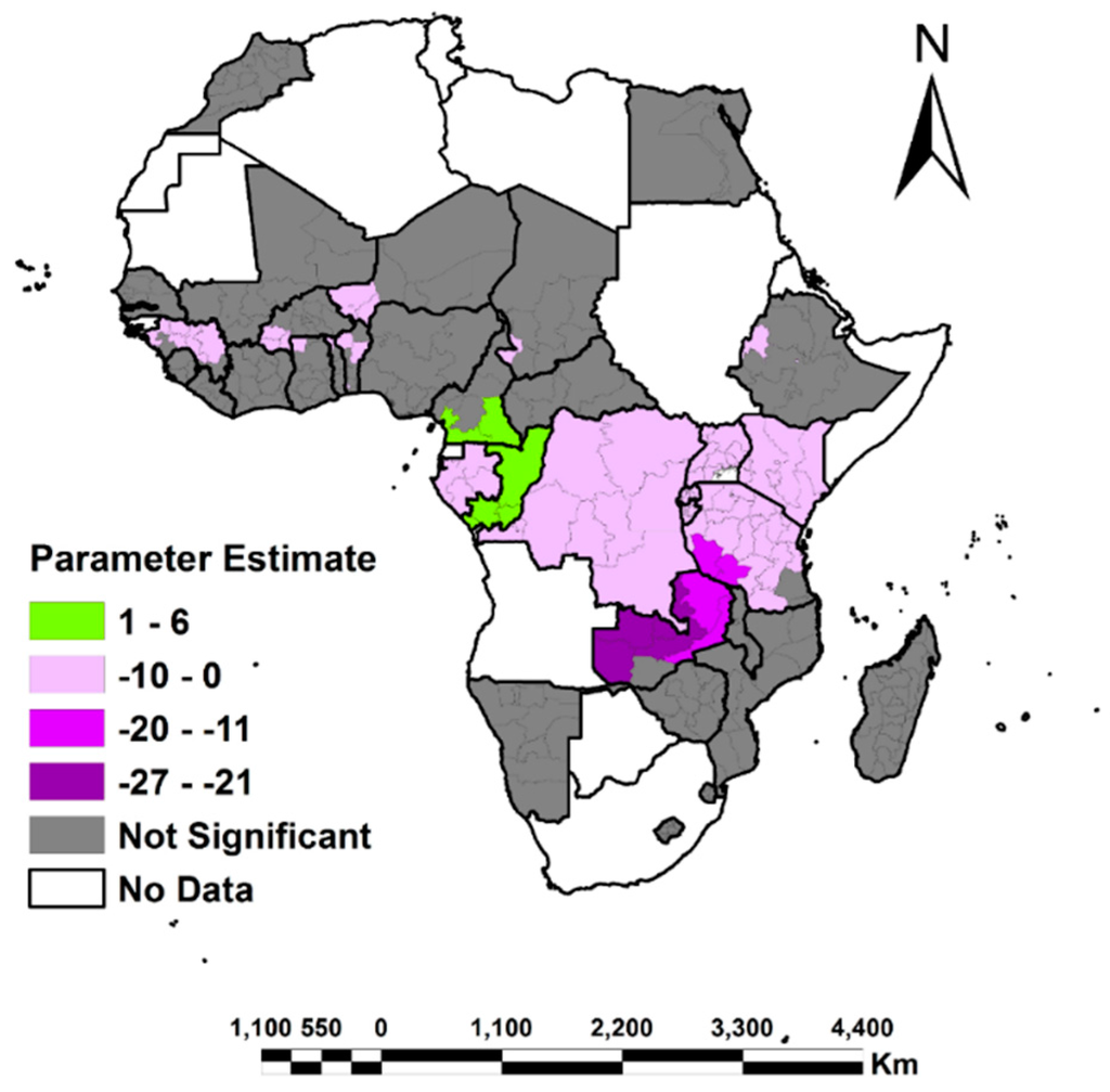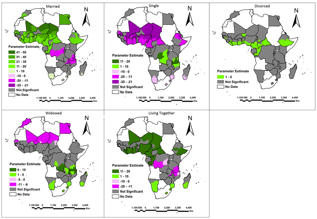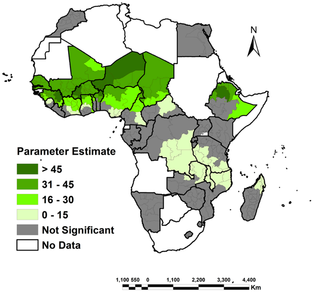Within the literature, several socioeconomic and demographic factors have been identified as key determinants affecting women’s access to land in Africa. These include marital status [3,4,5], age, level of education [6,7,8], place of residence (rural/urban), wealth class [9,10], number of children, and monogamous/polygamous relationships. Many studies also indicate that population density and the HIV epidemic also play an important role. One common assumption at the center of these studies—and with regression modeling in general—is that the relationship between women’s access to land and its determinants is globally constant across the extent of the modeled population or study area. In some cases this is appropriate, but in others spatially static model parameters serve to obscure local heterogeneity. When that variation is great, this can lead to misleading results and may be counterproductive when adopted for addressing policy issues that have a wider impact such as women’s access to land.