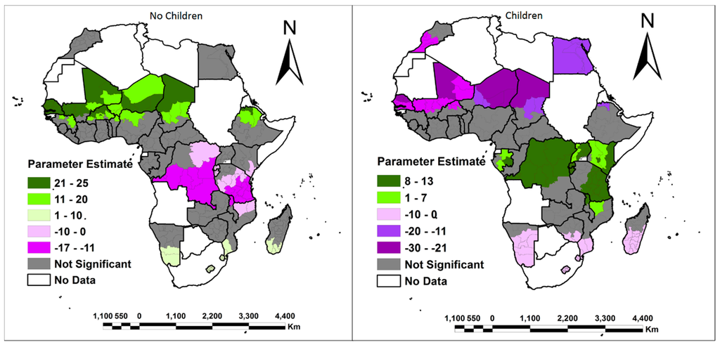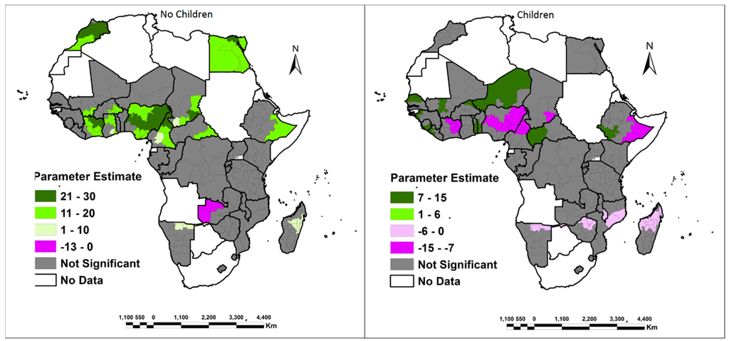 Conversely, results from this study also offered a different view by suggesting a predominantly positive association with access to both own and family land for childless women from West Africa, North Africa and Ethiopia. According to [40], childless women in West Africa have a better chance of accessing land through purchasing of land or renting land. This has been enhanced by the fact that they grow mainly cash crops (cocoa, oil palm etc.), which gives them the financial resources to go and buy or rent land. According to [41], another important channel through which childless women could be accessing land is the traditional transfer of land as gifts from family or spouse, which is a common practice in West African countries. Furthermore, positive law reform measures in countries such as Mali and Ghana has made it easier for women, with or without children, to hold land but only on a usufruct basis, authorizing them to work family-owned land and draw a wage [42].