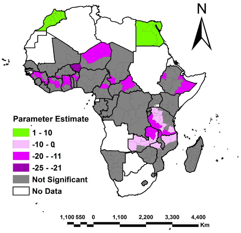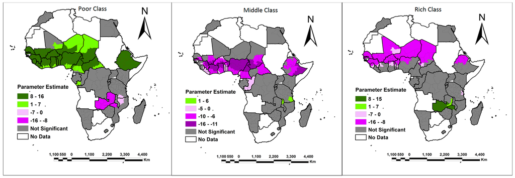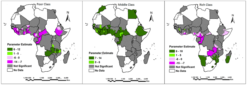 In addition, analysis of the results also highlighted the fact that middle class women were positively associated with access to their own land only in West Africa, North Africa and Ethiopia when compared to family land. The exception was in northern Malawi, Lindi and Mtwara administrative regions in Tanzania where the middle class women were positively associated with access to family land. Women classed as rich in Namibia, Lesotho, Swaziland, parts of Zimbabwe (Midlands, Masvingo, Manicaland, Mashonaland East and Matebeleland South provinces), and southern and central Madagascar, as well as few regions in West Africa, had access to their own land. In addition, large portions of Zambia were associated with rich women having access to family land than own land. However, large portions of West Africa were dominated by a negative significant association between rich women and access to both own and family land.