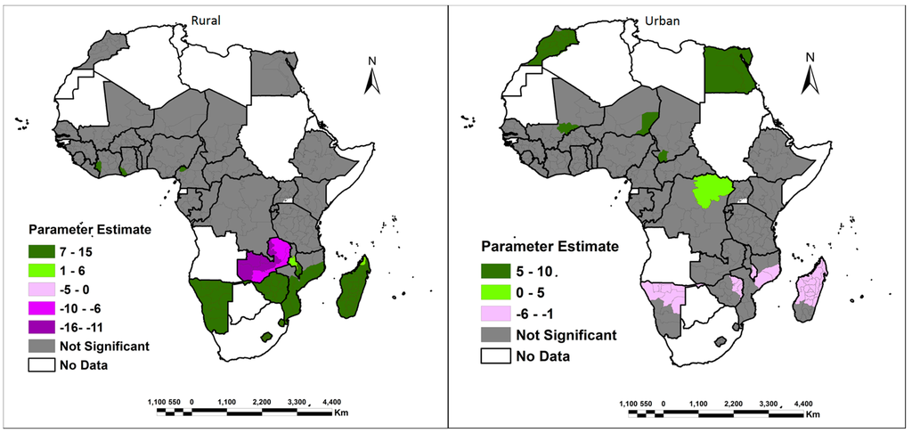 The relationship between rural areas and women’s access to their own land was mostly not significant across the continent. The exception was in Southern Africa where rural women in Namibia, Zimbabwe, Lesotho, Swaziland, Madagascar and southern parts of Malawi were positively associated with access to their own land (Figure 15). These women could have benefitted from the various land reform programs carried out in Southern Africa and aimed at rural folk. Examples of land reform programs include the Gender Policy of the Ministry of Agriculture of 2005 in Mozambique, and the Fast Track Land Reform Program of 2000 in Zimbabwe, which sought to redistribute land mainly among the rural people who had small plots and include women in the programs. In addition, migration to urban centers by men seeking other forms of employment has resulted in a rapid rise in the number of rural families that have women as the heads of households and have naturally taken over access to land left over by partner’s/husbands/fathers/brothers.