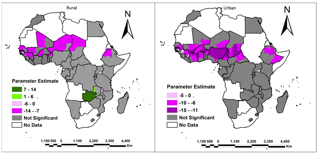 Access to own land was only positively associated with urban women in Egypt, Morocco, Orientale region in DRC, Mopti region in Mali, Diffa region in Niger and Logone Occidental prefecture in Chad. In these regions, urban women find it easier to access land for agricultural purposes in the periphery of urban areas where the plots are small, cheap and readily available. Ajani et al. [47] attributes this to the fact that urban crop production has been “feminized”, as the men move out to other informal or formal sectors like trading, industry or commerce. Finally, Figure 15 and Figure 16 show that women in West Africa had difficulty accessing land irrespective of whether they lived in rural or urban areas.