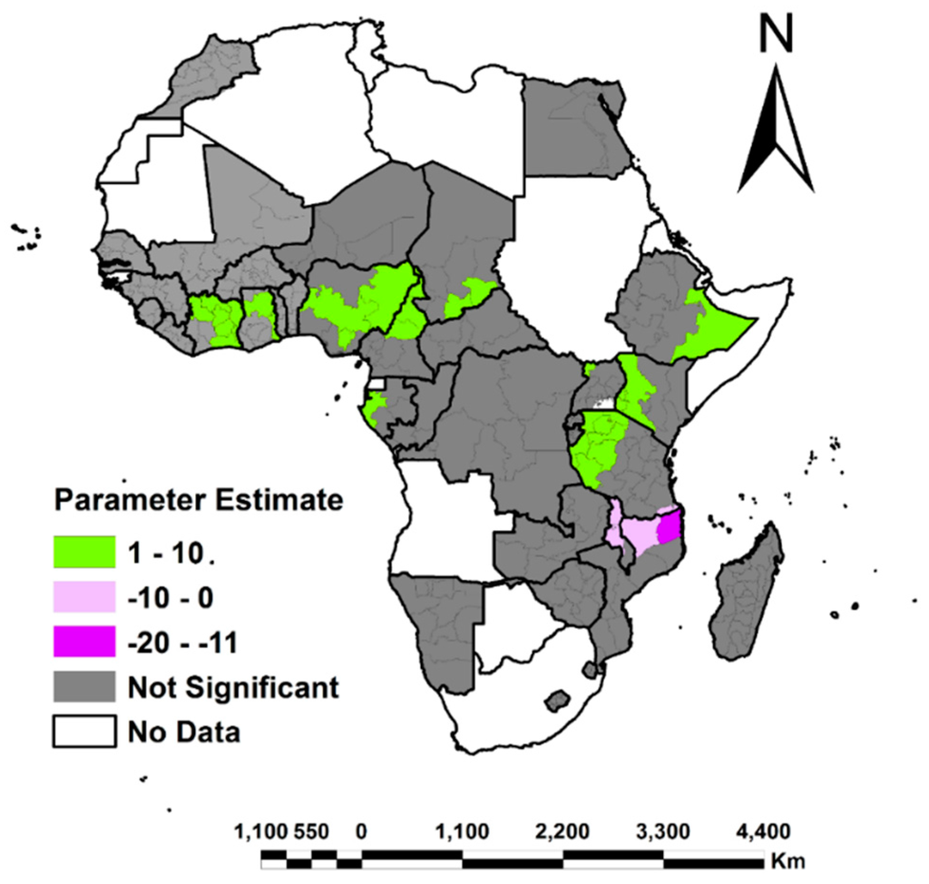 As far as urban women were concerned, their association with access to family land was mainly negative and significant only across West Africa and Ethiopia (Somali, Afar and Amhara administrative districts) (Figure 16). This is because in urban areas people from the same family rarely live close together and have access to the same land that can be classed as family land. That leaves, access to own land, which was still negatively associated with urban women, for example in Southern Africa (Figure 15). Their financial status usually affects their access to land since most of it is for sale. Taking into account the cost of urban land, and the fact that it is scarce, very few urban women would be able to afford it and most are often squeezed out of the market by their male counterparts. These observations are in line with those of [46] who observed that urban women and men in general are finding it difficult to access land due to its costs and to the fact that African urban settlements are fast growing, crowding-out agricultural land often leading to the conversion of peri-urban lands into housing estates.