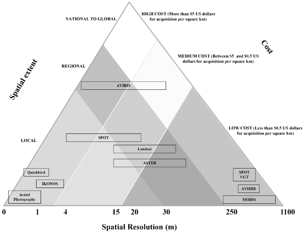 The satellite sensors that are most suitable for extraction of information valuable for mapping and monitoring GDEs are presented in Figure 1. Sensor suitability for a specific application depends on the resolving power of the sensor, namely the spatial, temporal, radiometric, and spectral resolution. For this reason, one of the crucial activities when using remote sensing for GDE mapping is the careful selection of the suitable dataset that can provide information with the required quality, at the required spatial and temporal resolution. However, the choice of using a given sensor is typically limited by the cost of the satellite imagery [9]. Figure 1 can be used for the selection of remote sensing imagery for GDE detection (from the satellite instrumens that are suitable in terms of spectral and radiometric resolution) considering the cost of acquisition of the image per km2 [55], the spatial resolution required, and the spatial extent of the studies. Additionally, a review of previous studies in which products from these sensors have been used for identifying the location and extent of GDEs is presented in Table 1 [23,57,81,87,100,101,102,103,104,105,106,107,108,109], with details regarding the main characteristics (such as spatial resolution and mapping scales) of each sensor and applications that have benefited from and could potentially take advantage of the sensors’ capabilities to map GDEs. The approximate mapping scale for which each sensor can be used (Column 3) is based on the spatial resolution of the data.