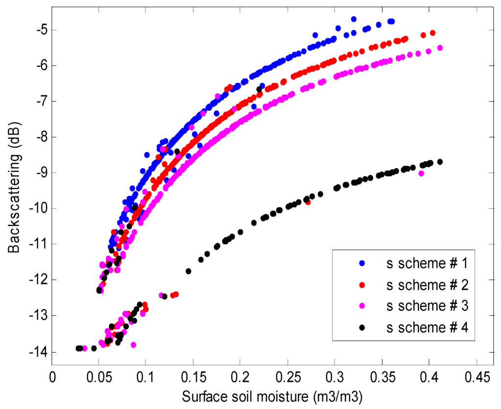Table 2 also shows that a spatial average of soil moisture retrievals was largely altered by the s scheme. From Figure 1 and Table 2, it was found that the RMS height has an inverse relationship with soil moisture [], implying that surface becomes smoother if soil porous media is filled with water. In other words, higher RMS heights (s scheme #4) estimated drier. It is considered that such an inverse relationship between surface roughness and soil moisture is attributed to a negative exponential function of roughness as shown in Equation (3). Similarly to this result, previous studies [,] also carried out the similar sensitivity analysis of the radar signal to various land surface parameters over short grass, and found that the most influencing parameter is the surface roughness. However, this impact may be different in different incidence angle or land cover conditions.