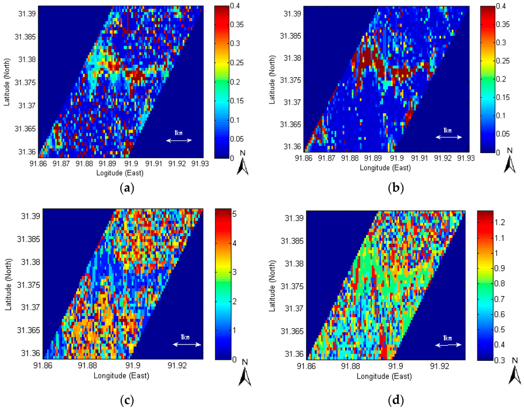 To more systematically assess the magnitude of roughness inversion error propagations, the results in Section 3.1 were further compared with other sources of retrieval errors: backscattering measurement error (e.g., calibration errors, vegetation attenuation). Especially in arid or semi-arid regions covered with short grassland, as in the Naqu site of this study domain, the multiple backscattering effects from vegetation added to or subtracted from moisture in the underlying soil generate measurement errors. Studies [,,] previously suggested a simple correction model for vegetation effects. However, in practice, it is difficult to widely apply that to diverse regions, because canopy and instrumental characteristics should be thoroughly specified.