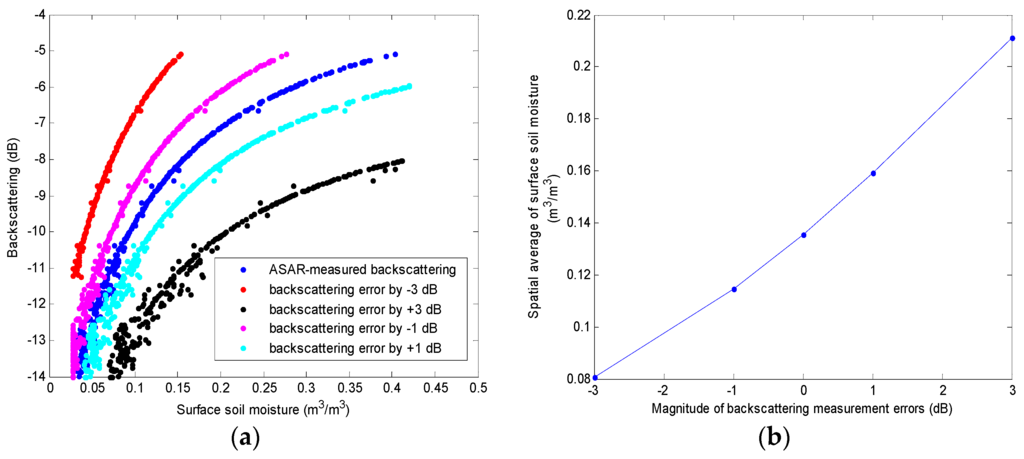 Backscattering experiments: (a) Relationship between ASAR backscattering with various hypothetical errors and resultant soil moisture retrievals; and (b) the spatial average of the surface soil moisture retrieved with different backscattering error magnitudes used by (a) on DoY 221.