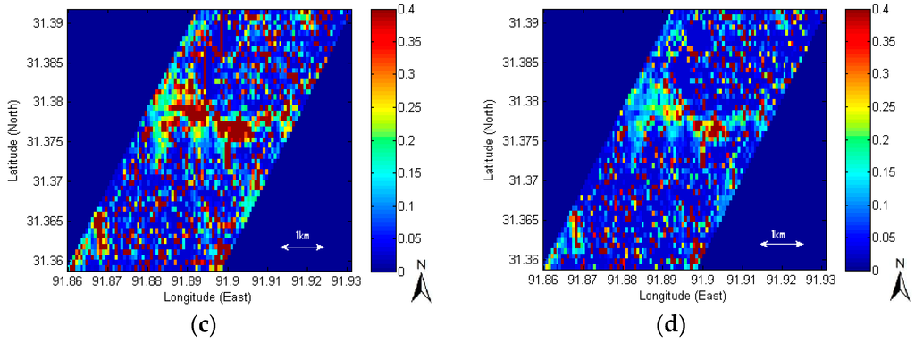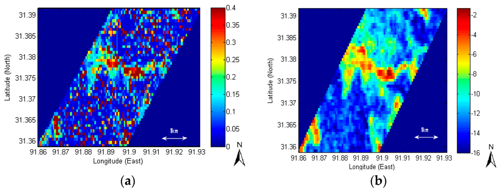 The spatial average of the additive backscattering error scheme was higher at 0.1592 m3/m3 than that of the original SAR retrieval (Figure 4a) at 0.1356 m3/m3, while that of the subtractive backscattering error scheme was lower than that at 0.1144 m3/m3. The original SAR backscattering is shown in Figure 4b. The spatial distribution of soil moisture retrieved with the ASAR backscattering hypothetically overestimated by 1 dB is illustrated in Figure 4c, while that of soil moisture hypothetically underestimated by 1 dB is shown in Figure 4d.