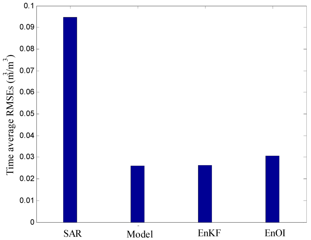 In Figure 5, to further assess the SAR errors, the field measurements are compared with SAR, and data assimilation results at a single pixel nearest to a local point station. The SAR overestimation was illustrated to be consistent with discussions above. The EnKF scheme and the EnOI scheme successfully mitigated the overestimation of original SAR retrievals by being diluted with a calibrated model showing the lowest RMSEs.
