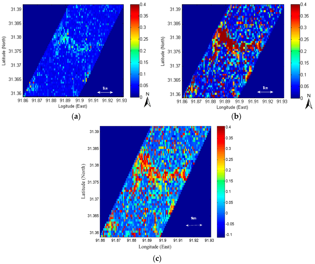 The entire study area was estimated to be mostly dry by a calibrated SVAT model in Figure 6a, while the SAR-retrieved surface soil moisture in Figure 6b was estimated to be much higher than that. The model estimation of those was considered more reliable, based upon the time-average field measurements of soil moisture at 0.0614 m3/m3 during experimental period, and the lowest RMSEs in Figure 5. A spatial average of SAR surface soil moisture was much higher at 0.1140 m3/m3 than that of a calibrated SVAT model at 0.0565 m3/m3. This SAR overestimation in Figure 6b is attributed to the roughness inversion errors. First, the assumption of time-invariance used in Section 2.2.1 as the method for inverting roughness is violated in the event of rain, because the roughness in fact changes due to changes in penetration depth or a film of standing water formed by rain (0.4 mm/d, according to the field measurements). In addition, Figure 2 also supports this. A large difference (model-minus-SAR retrievals) in Figure 6c overlaps with the difference in soil moisture retrievals between Figure 2a,b in Section 3.1 arising from difference in roughness conditions. Based upon consistency between this Section, and Section 3.1, it is considered that Figure 6c further supports the finding that the overestimation of SAR soil moisture is related to roughness.