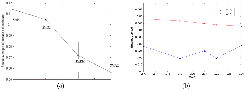 (a) Spatial average of surface soil moisture (m3/m3); (b) Ensemble evolution of EnOI and EnKF.