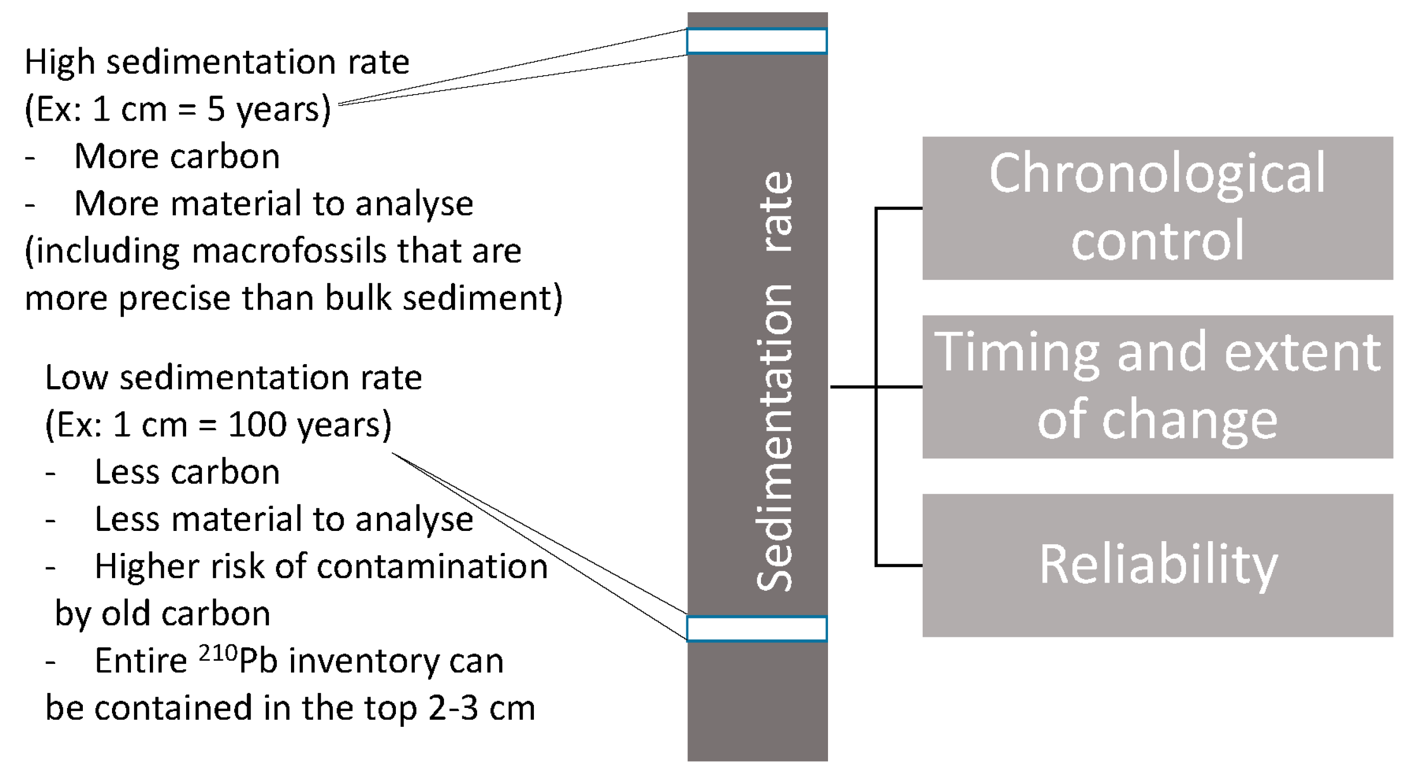 Lakes are integrated systems that encompass dynamic interactions between geosphere, hydrosphere, atmosphere and biosphere. As such, they are superior integrators of whole landscape changes [5,6], and are especially well-suited to cross-boundary studies, such as air-water and land-water interfaces. Long-term dynamics in lakes are strongly driven by climate variability, including hydrological cycles (e.g., [7,8]) and variations in temperature (e.g., [9]) as well as by other environmental changes, such as soil and vegetation development (e.g., [10,11]). These processes can have multiple effects on aquatic physico-chemistry through biogeochemical cycles (see [12] for examples on carbon).They are increasingly influenced by anthropogenic stressors, including land-use changes, organic and inorganic contamination and biotic homogenization, which lead to progressively complex interactions in the functioning of lakes (e.g., [13]). Lake sediments assimilate materials that come from lake basins, including watersheds (terrestrial input) and airsheds (atmospheric input), and conserve them in a chronological sequence. Many of these materials, including biological remains, geochemical signatures of biota and pollutants, such as heavy metals, preserve well for extended periods of time (on the order of millennia) [14]. Consequently, stratigraphic signals of natural and anthropogenic change are particularly well preserved in lake sediments. Paleolimnology is the science that studies the physical, chemical and biological characteristics of lake sediments [14]. It is an interdisciplinary science that can produce highly resolved time-series data for the analysis and interpretation of environmental change at various timescales (annual to millennial; see [15], Chapter 2), offsetting the paucity of direct long-term measurements, which in most regions are often rare or altogether lacking. Good chronological control is vital to the paleolimnological approach, with higher organic sedimentation rates (or input) usually increasing temporal resolution (Figure 1). The concept of paleolimnology as a tool for effective ecosystem management is not new (e.g., [16,17]), but the approach remains marginal in its application to environmental problem-solving, despite the numerous advantages that the long-term view provides in developing more robust ecosystem management [1]. Here, a number of examples are presented that illustrate the ways in which lake sediment archives record human-induced environmental change and how, in the context of the Anthropocene epoch, the period when Earth system processes are dominated by human activities (see below), paleolimnology is becoming an indispensable tool to inform the management and conservation of freshwater ecosystems and their catchments as well as the services that they provide.