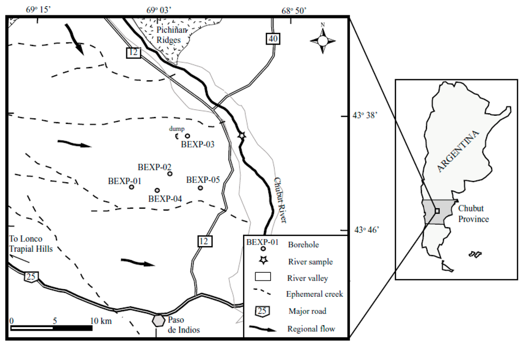 The climate of the area is cold and arid, with low and irregular rainfall (~200 mm/year), and average temperatures range from 3 °C in winter to about 19 °C in January and February. In general, precipitation falls as snow in winter, with minimum temperatures frequently below −10 °C between June and July [13]. Recharge to the aquifers mostly occurs through rainfall and by direct infiltration from snowmelt in spring. Early estimates from [14] showed that the potential evaporation of the region exceeds 700 mm/year, which results in an annual water deficit of approximately 500 mm. This is consistent with the formation of soils that are extensively devoid of organic matter and are commonly enriched in argillites and carbonates. Thus, the regional soils can be classified as aridisoils covered by scrub vegetation and to a minor extent as entisols, which develop in eolian depressions, drainage lines, and the floodplains of the Chubut River [15]. Poor soils and harsh climatic conditions mean that agricultural activities in the area are mostly restricted to stock-grazing, particularly sheep herding. In general, pastoral activities are conducted by small producers, who reside in the region and usually have less than 300 animals [16].