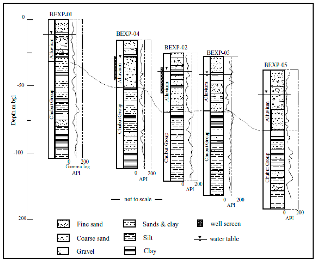 A drilling campaign was carried out at five sites using air reverse circulation to provide a continuous return of formation and water samples from a maximum depth of 108 m below ground level (BGL). The method involved air being blown down through the annulus of rods, with samples being returned to the surface through an inner tube in a drill string. This drilling method was chosen, as the cuttings and water are not contaminated with drilling additives or mixed with the formation materials and the sample is more representative. A drill hammer was used to achieve greater penetration through hard pebbles and cobblestones. Test holes of approximately 140 mm in diameter were drilled to selected depths, and logged for lithology at 3 m intervals. The boreholes were drilled without casing, although a precollar of about 12 m was typically required to prevent washing and scouring of superficial materials. Simultaneously, water quality parameters were measured along the vertical profile. Groundwater standard parameters (conductivity, pH, temperature) were measured with the use of an YSI ProDSS hand-held probe, and a Hatch test kit was used to estimate nitrate and alkalinity values in the field. Downhole geophysics was run immediately after the completion of the test hole. However, caving and collapse of the walls often compromised the tool’s deployment, especially in shallow horizons, where gravels and sands were interbedded in thin layers. Therefore, only a natural gamma log was run inside the drill string to better define the abundance of clay minerals in the surrounding sediments. The gamma log was run at a speed of about 3 m/min both on the way down and up. Two of the most promising boreholes were reamed to a suitable diameter in order to stabilize the formation, and a 150 mm PVC casing installed to selected depths. Over 50% of the saturated zone was intercepted using PVC screens 18 m in length, with a slot aperture of 1 mm. Siliceous gravel and drill cuttings were used to fill the annulus and construct a suitable test bore. The newly constructed bores were then developed by surging and pumping air to lift water and drilling fluids toward the surface. The discharged water was directed into a mud pit, and flow rates were estimated.