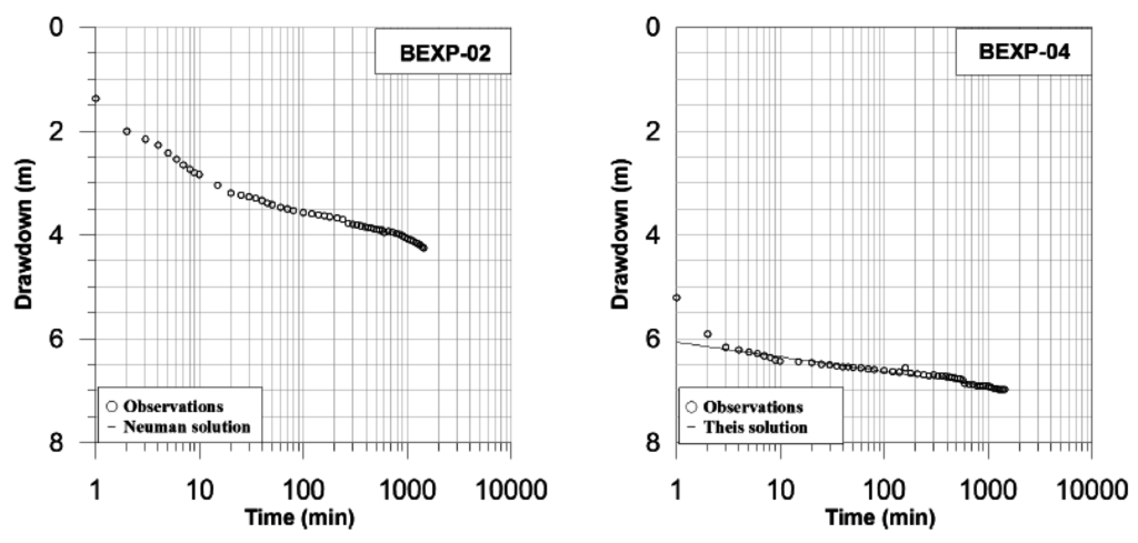 Constant rate tests were then conducted for 24 h at a rate of 4 L/s followed by recovery. Discharge rates showed minor oscillations due to fluctuations in the pump system, but the impact on the test was considered negligible. Data collected at bore BEXP-02 shows that the time-drawdown curve can be divided into three distinctive segments that correlate to the delayed water-table response of an unconfined aquifer [28].
