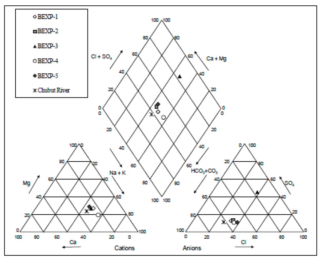 Groundwater from the exploration holes was collected through the rig cyclone. For constructed bores, samples were taken at the beginning and end of the hydraulic tests in order to evaluate any potential effects of pumping on water quality. Additionally, a deionized water blank and a duplicate were taken for quality control. Filtration was carried out in the field by the use of a 0.45 µm membrane, and samples stored at 4 °C in appropriate containers. They were then sent to a private nationally accredited laboratory in Buenos Aires, Argentina to be analyzed by ion chromatography and ICP-AES.