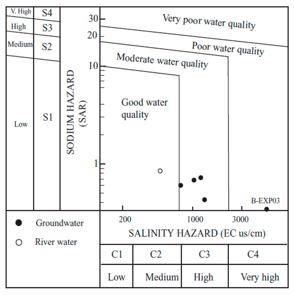 The suitability of water quality for horticulture irrigation was also explored (Table 4). The quality of irrigation water was determined on the basis of (a) total salinity; (b) sodicity; and (c) anion composition and concentration of toxic elements [37]. A high salt concentration in water leads to the formation of saline soils, while, high sodium leads to development of alkali soils [38]. Electrical conductivity values indicate that in most cases the waters would have medium (C2: 250 < EC < 750 µS/cm) to high salinity (C3: 750 < EC < 2250 µS/cm), with localized higher values (C4: EC > 2250 µS/cm) attributed to anthropogenic contamination. Waters in the western margins of the area (BEXP-01) would be acceptable for crops with a moderate salt tolerance, although, in general, plants having good tolerance for salt require special management practices. The sodicity hazard provides another indication of the impact of irrigation on agriculture. A common measure parameter to estimate this hazard is the sodium adsorption ratio (SAR), defined by the formula:
