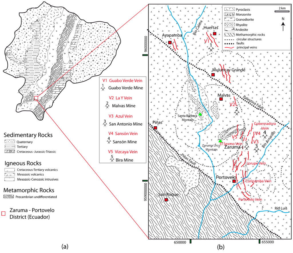 - Spencer, R.M.; Montenegro, J.L.; Gaibor, A.; Pérez, E.P.; Mantilla, G.; Viera, F.; Spencer, C.E. The Portovelo-Zaruma mining camp, SW Ecuador: Porphyry and epithermal environments. SEG Newsl. 2002, 49, 8–14. [Google Scholar]