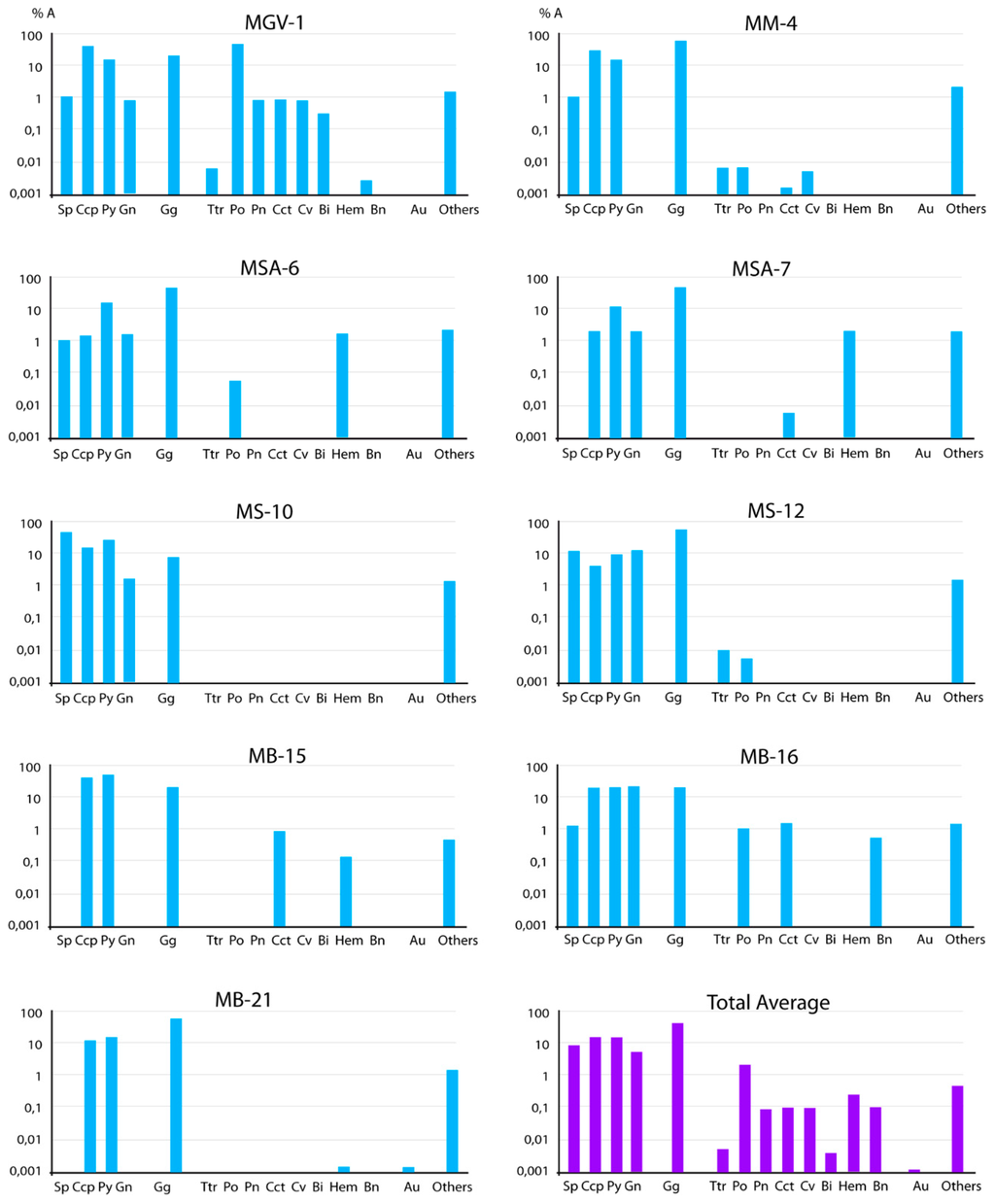 - Automated identification and quantification of 15 mineral phases using multispectral images (Case 1) was carried out. These phases were previously identified with reflected light optical microscopy and by visual inspection with a binocular microscope, and they agreed with the expectations based on previous studies. The results of this experiment show that the ore mineral quantification on polished sections is possible applying OIA methods, allowing obtaining complementary information to traditional (qualitative) ore petrographic studies.