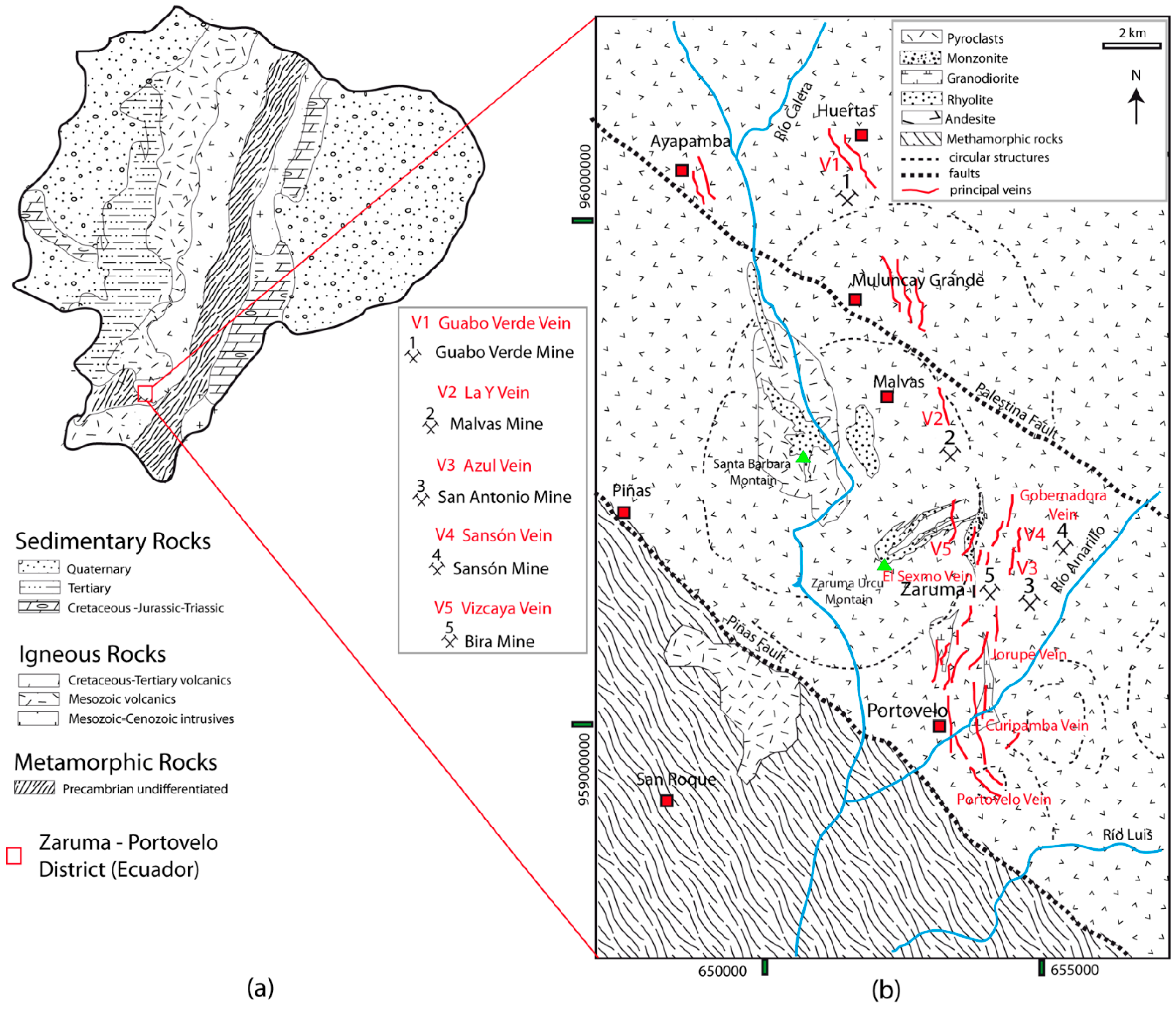 (a) Simplified geological map of Ecuador and location of selected area; and (b) geological maps of Zaruma-Portovelo gold field with basic geology (volcanic and intrusive rocks), principal structures and more important veins. Modified from [38] with data from [39,40,41,42].