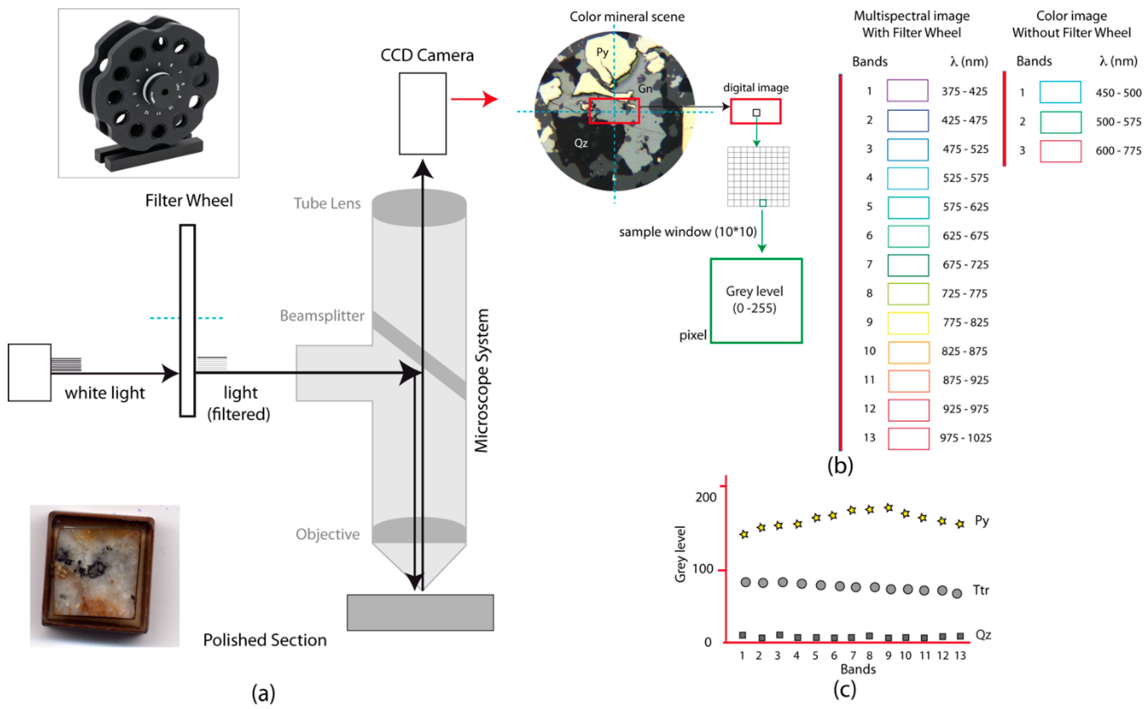 Diagram of the experimental setup: (a) Configuration of reflected microscopy, filter wheel and CCD camera for multispectral image analysis. (b) An example of an optical reflection microscopic image with an example of sample window of 10×10 pixels. Multispectral and RGB bands with related wavelengths associated. (c) Grey level values from Py, Ttr and Qz plotted against bands (13 wavelengths). Mineral abbreviations follow [50].