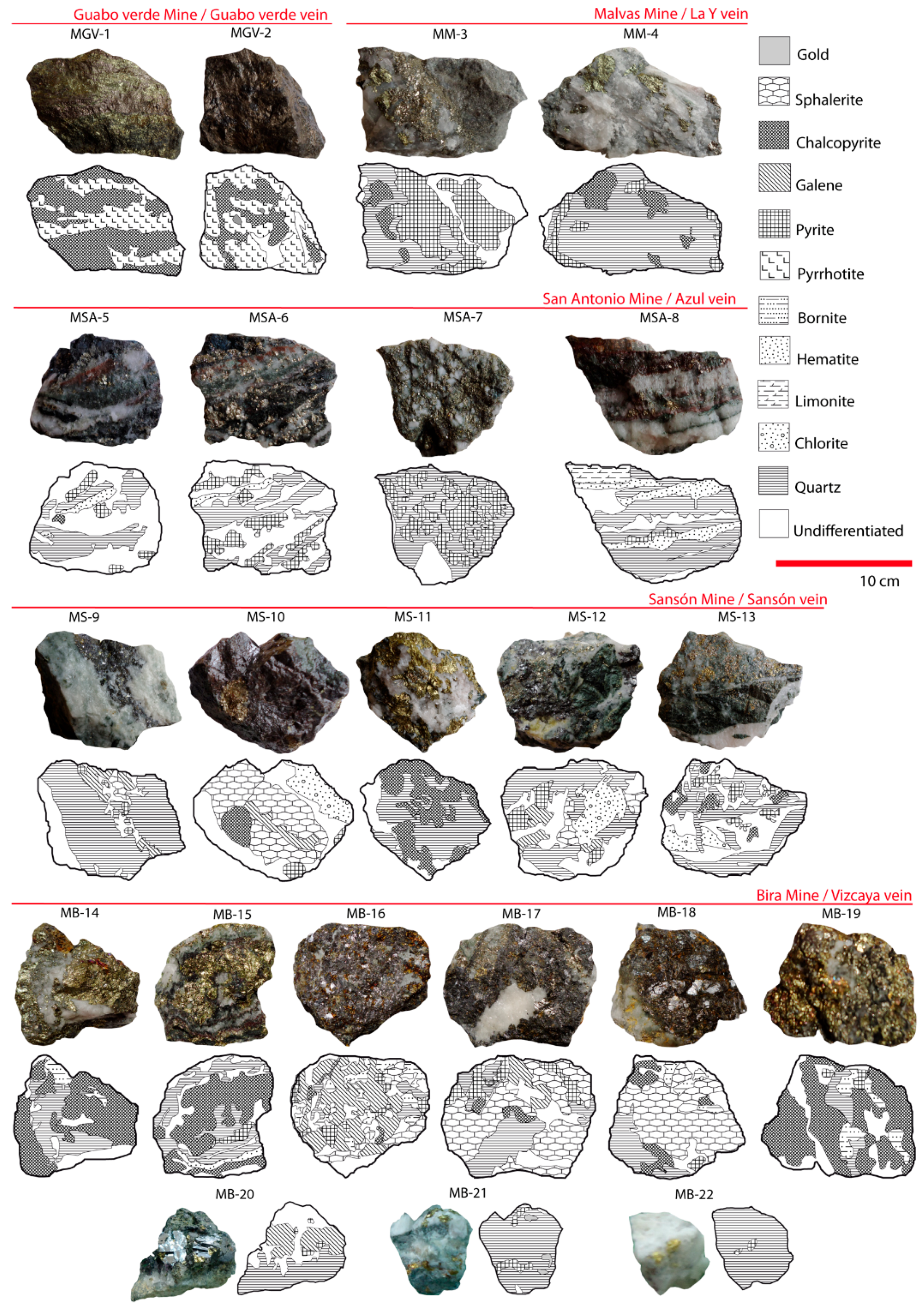 Preliminary identification of minerals for each hand specimen (22 samples) is shown in Figure 4, in which the principal mineral species visible with unaided eye are shown. The mineralogy identified in the hand samples (gold, sphalerite, chalcopyrite, galena, pyrite, pyrrhotite, bornite, hematite, limonite, chlorite and quartz) and their description (i.e., MSA 5-6-8, banded quartz-pyrite-chlorite vein with pyrite-galena-sphalerite) allowed to: (i) corroborate that samples collected have representative mineralogy of the deposit; and (ii) choice samples to make polished sections. The results of the detailed microscopic study are shown in Figure 5, which displays representative mineral images, the main ore minerals and the ore texture, for each studied sample.