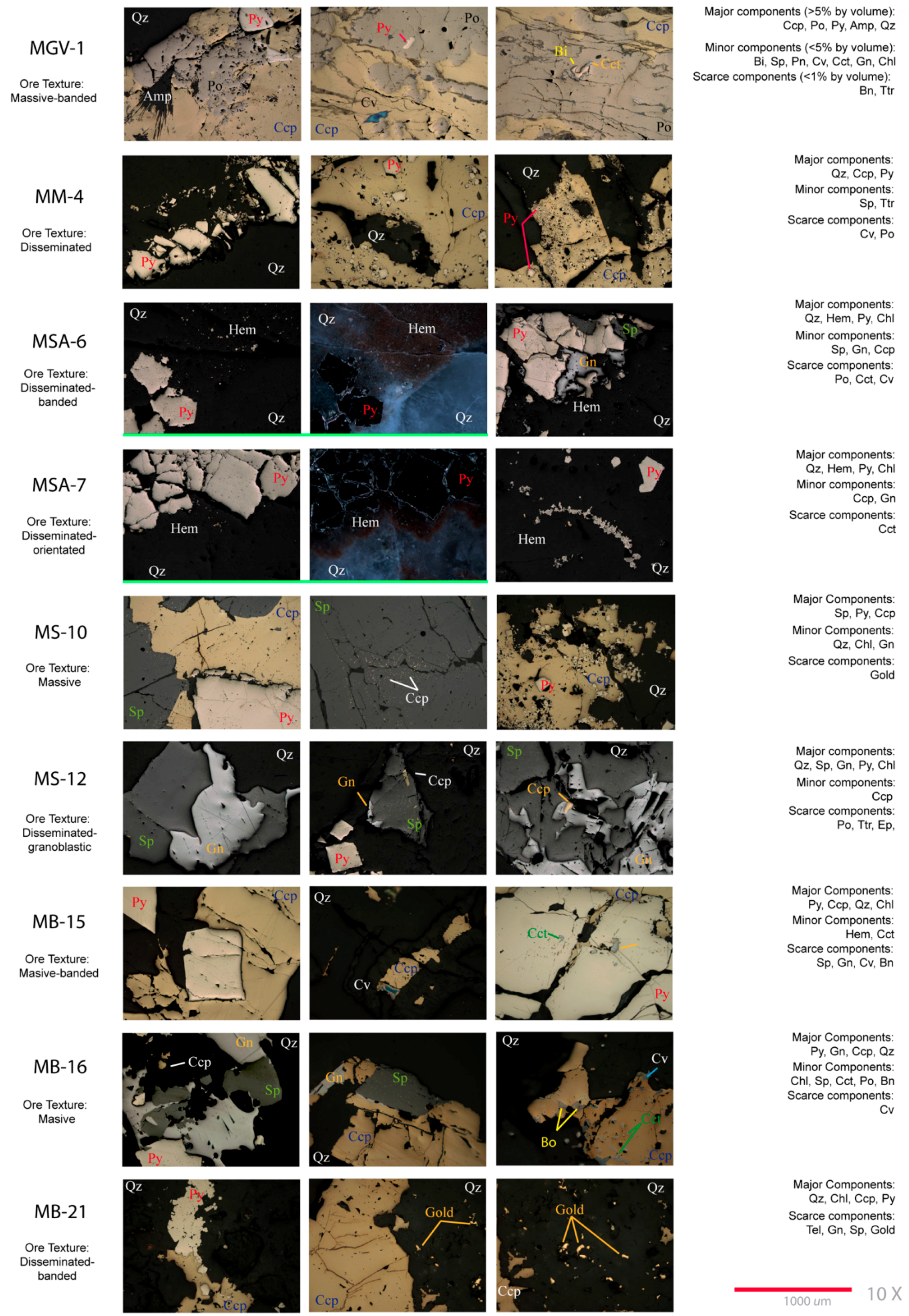 Reflected light photomicrographs and summary ore description of nine polished sections (objective lens magnification 10×: real grain size information provided by 100 µm scale bar at bottom right of the figure). Major, minor and scarce components are listed for each sample. Mineral abbreviations follow [50].