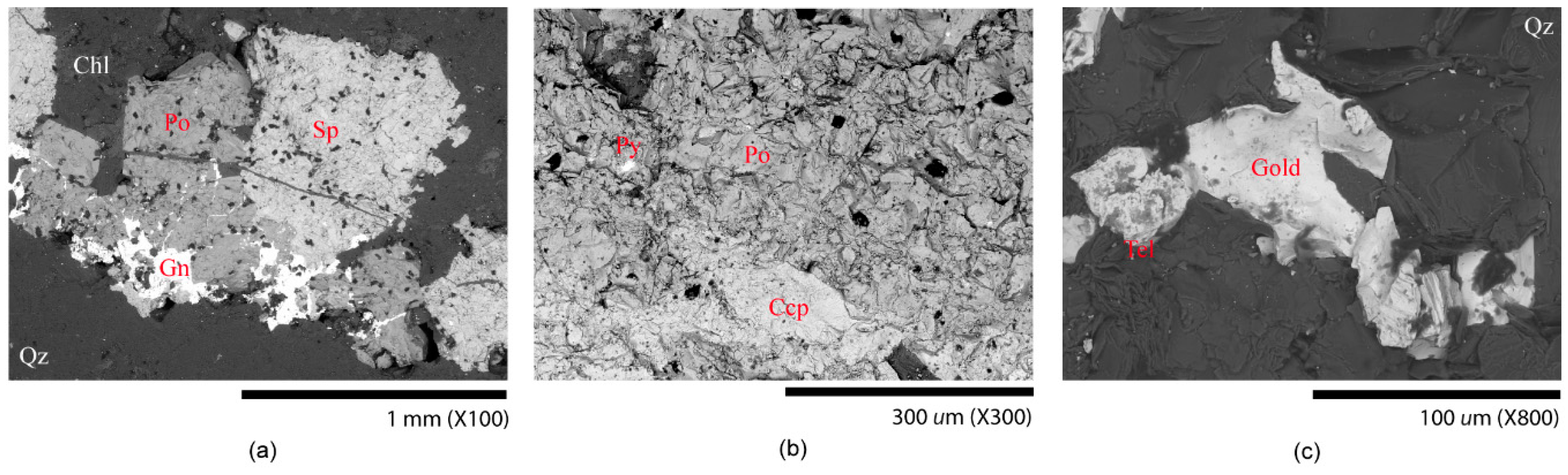 Backscattered electron micrographs of mineral associations. Images acquired using magnifications of 100× to 800: (a) MGV-1; (b) MS-12; and (c) MB-21 (assemblages of gold and telluride (hessite) in quartz vein).