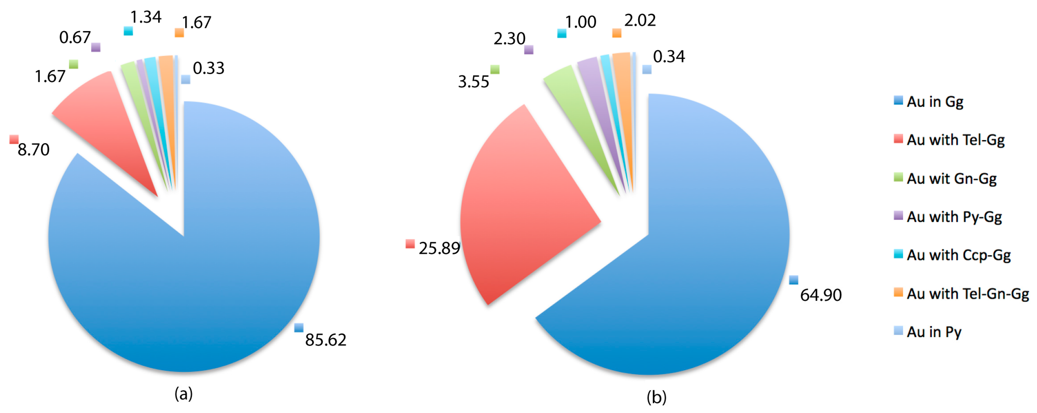 Pie charts showing frequency distribution of type of mineral association of gold in polished sections MB-21 and MB-21b: (a) as percent of total number of gold grains; and (b) as proportion of area of gold grains (i.e., % volume gold).