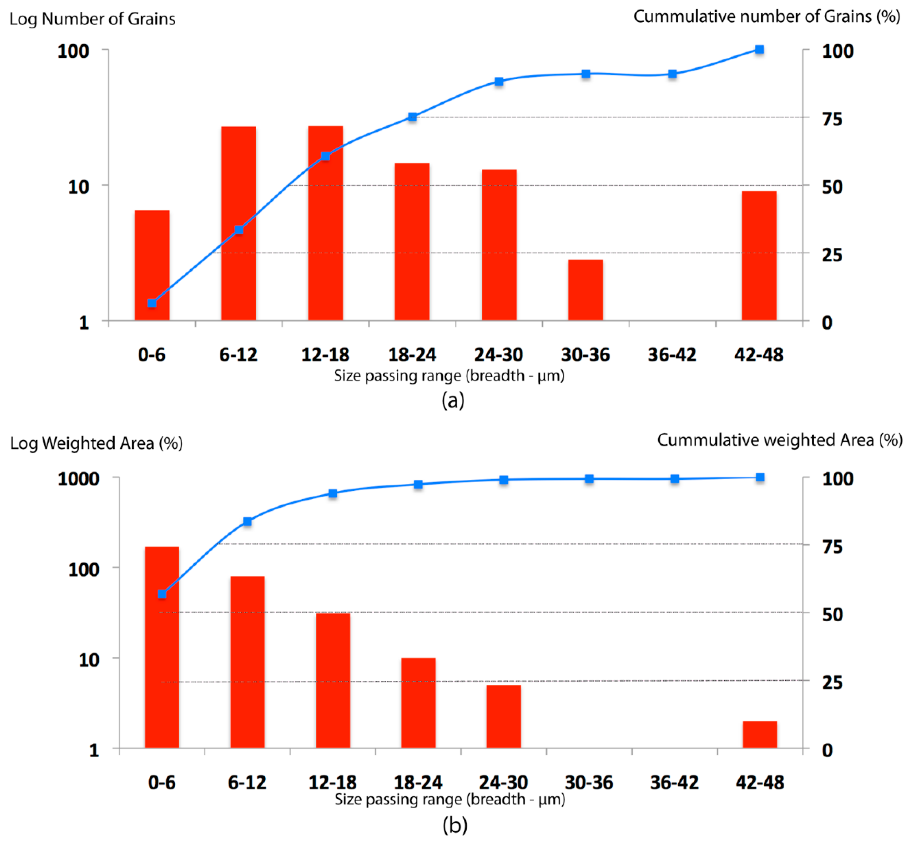 Ore samples: MB-21 and MB-21b. (a) X-axis vs. left Y-axis: frequency diagrams of number of gold-grains (log scale) related to gold size passing classes (breadth, µm) with red-bars. X-axis vs. right Y-axis: cumulative number of gold grains (%) related to gold size passing classes (breadth, µm) with blue-points. Dash lines represent percentiles 25, 50 and 75. (b) X-axis vs. left Y-axis: frequency diagrams of weighted gold-grain area (log scale) related to gold size passing classes (breadth, µm) with red-bars. X-axis vs. right Y-axis: cumulative weighted gold area (%) related to gold size passing classes (breadth, µm) with blue-points. Dash lines represent percentiles 25, 50 and 75.