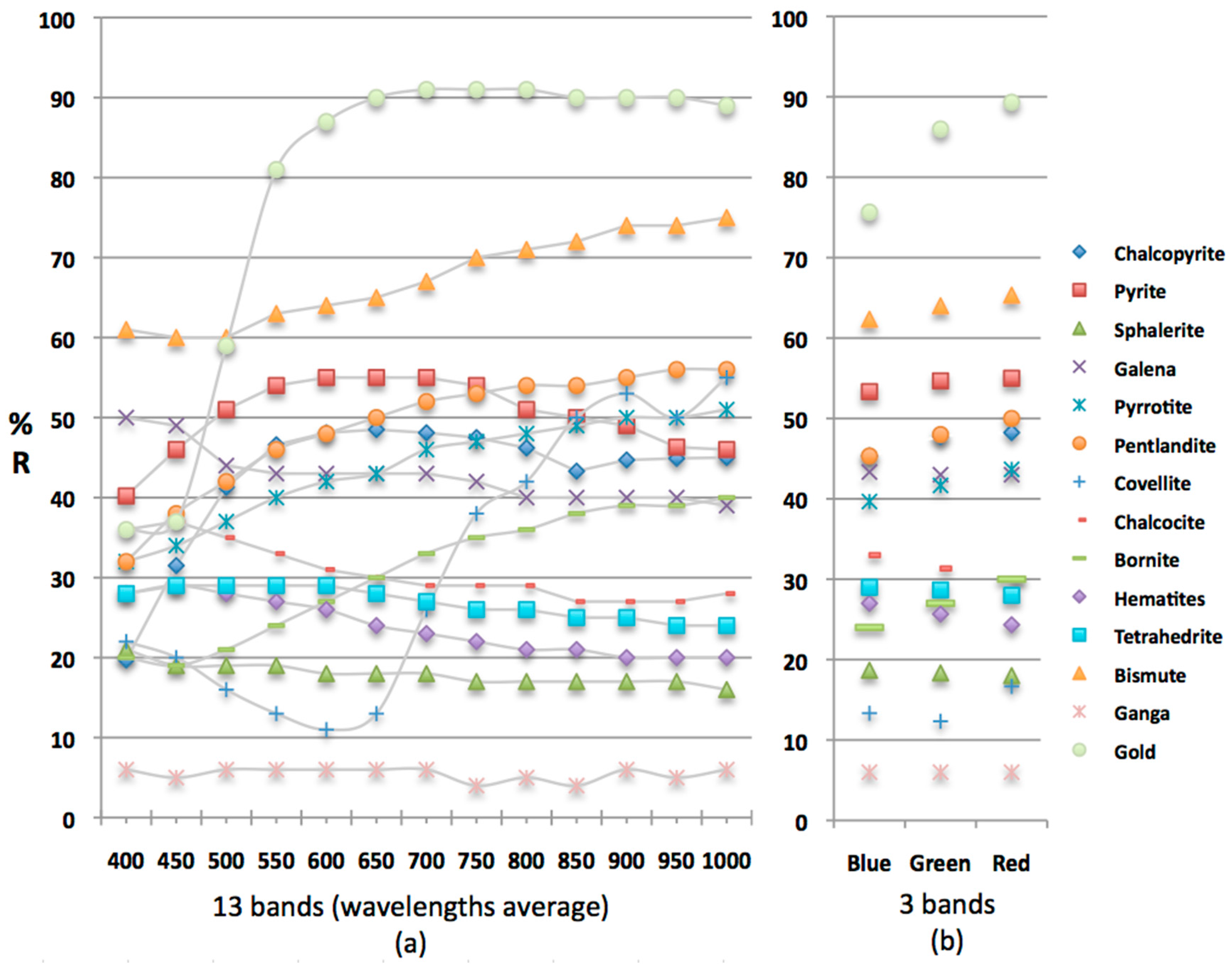 According to [17,29], multispectral image analysis has demonstrated its superior potential with respect to conventional color imaging. A complete set of filters permits: (i) obtaining information even out of the visible region (Figure 11a), thus expanding the range of analysis; and (ii) obtaining a stack of multispectral images that can be segmented using multivariate discrimination. Thus, multispectral imaging yields additional information as compared to color imaging mode [29]. However, using RGB images, difficulties remain when opaque minerals have similar colors and reflectivity (Figure 11b and Table 5) in plane light, making it virtually impossible to distinguish them [17]. Some ore minerals studied here show overlapping characteristics (grey intensity values or reflectance) under the white light of the color camera. Some examples of common overlapping minerals found in our samples are: covellite-sphalerite-hematite-tetrahedrite-chalcocite (Reflection: 17%–30%) and pyrrhotite-galena-chalcopyrite-pentlandite (Reflection: 41%–48%). In Figure 11b, it is possible to see the overlapping of minerals (average of Reflection -%-). The application of the multispectral CAMEVA System, using wavelength specific filters allowed overlapping minerals to be separated (Figure 11a and Table 5).