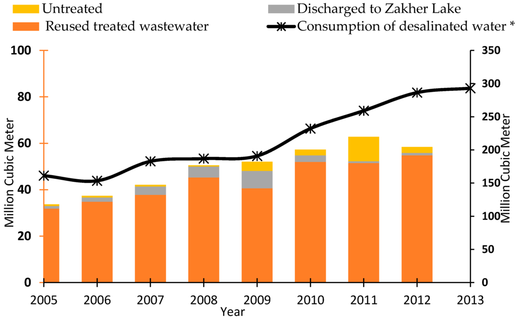 Desalinated water and wastewater figures from Statistics Centre—Abu Dhabi (SCAD) [30] (*Consumption of desalinated water is referred to on the right axis).