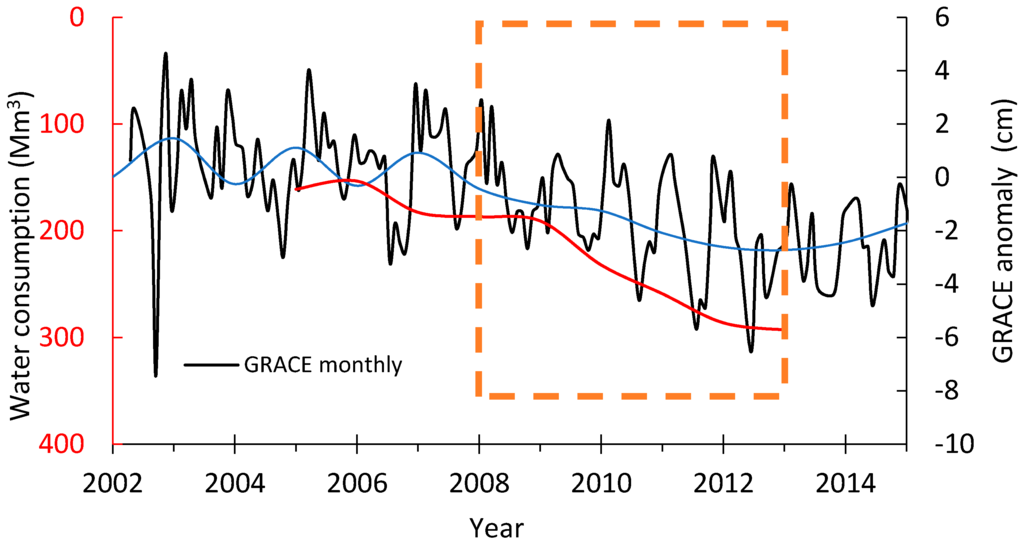 The change points detected in Figure 7 are in line with the variability of the water consumption reported in Figure 4, where an increase in water demand coincided with the 2008–2013 time period that corresponds to a severe depletion of the water storage based on the GRACE results. Water consumption records seem to stabilize starting from the end of 2013. More recent records are needed to confirm this trend.