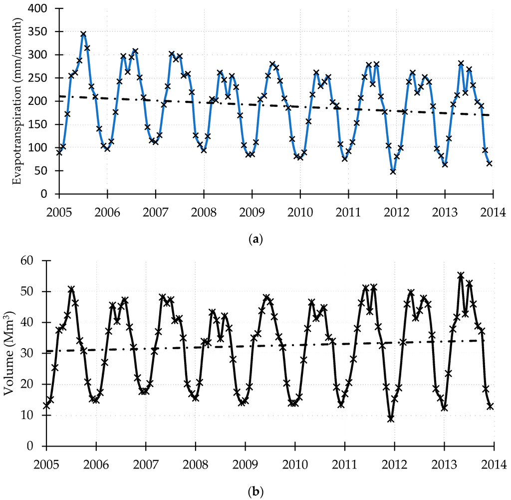Evapotranspiration is the main output from the system. It depends on meteorological variables, the expansion in agricultural areas and change in their extent, as well as the change in the discharged treated water and landscaping activities. In this study, the extent of agricultural area was obtained from Landsat images. Using a linear regression, the estimated annual areal increase in agricultural areas from the images was approximately 6 km2. The estimate of the evapotranspiration of the area ranges from 50 to 350 mm/month, with an annual average of 2264 mm (based on data from 2005 to 2014). Monthly evapotranspiration data is shown in Figure 5, from 2005 to 2014. The results show the existence of two peaks of evapotranspiration over a year, in the months of April and July. The lowest evapotranspiration was recorded in the month of January, reaching as low as 50 mm/month.