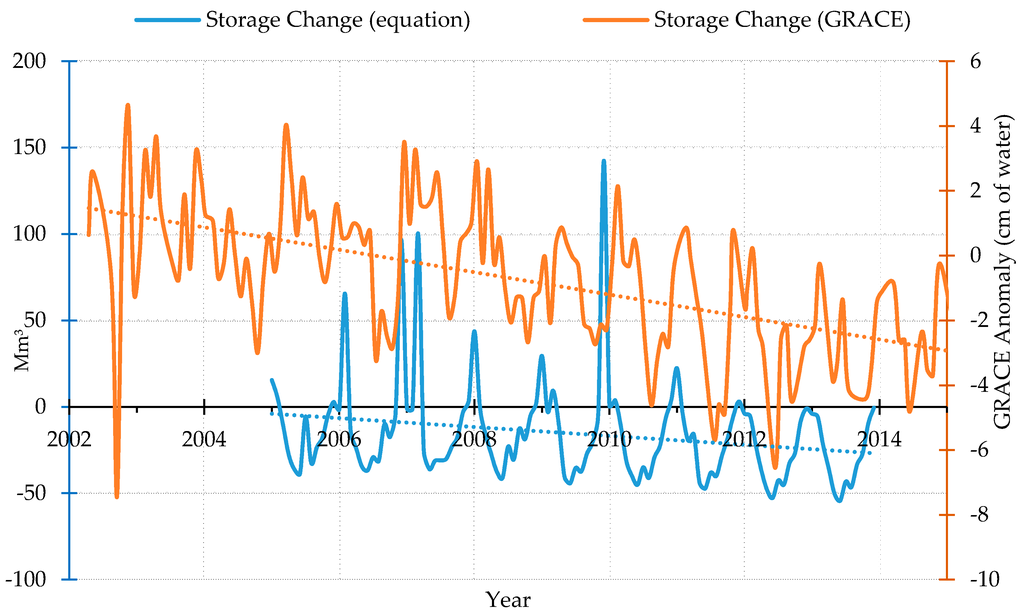 There is a clear agreement between the changes in storage calculated using the two datasets. They both show a significant negative trend when tested with the non-parametric Mann-Kendal test at a confidence level of 95%. The statistically significant negative trends in ΔS and GRACE readings corroborates the assumption of severe water depletion in the region.